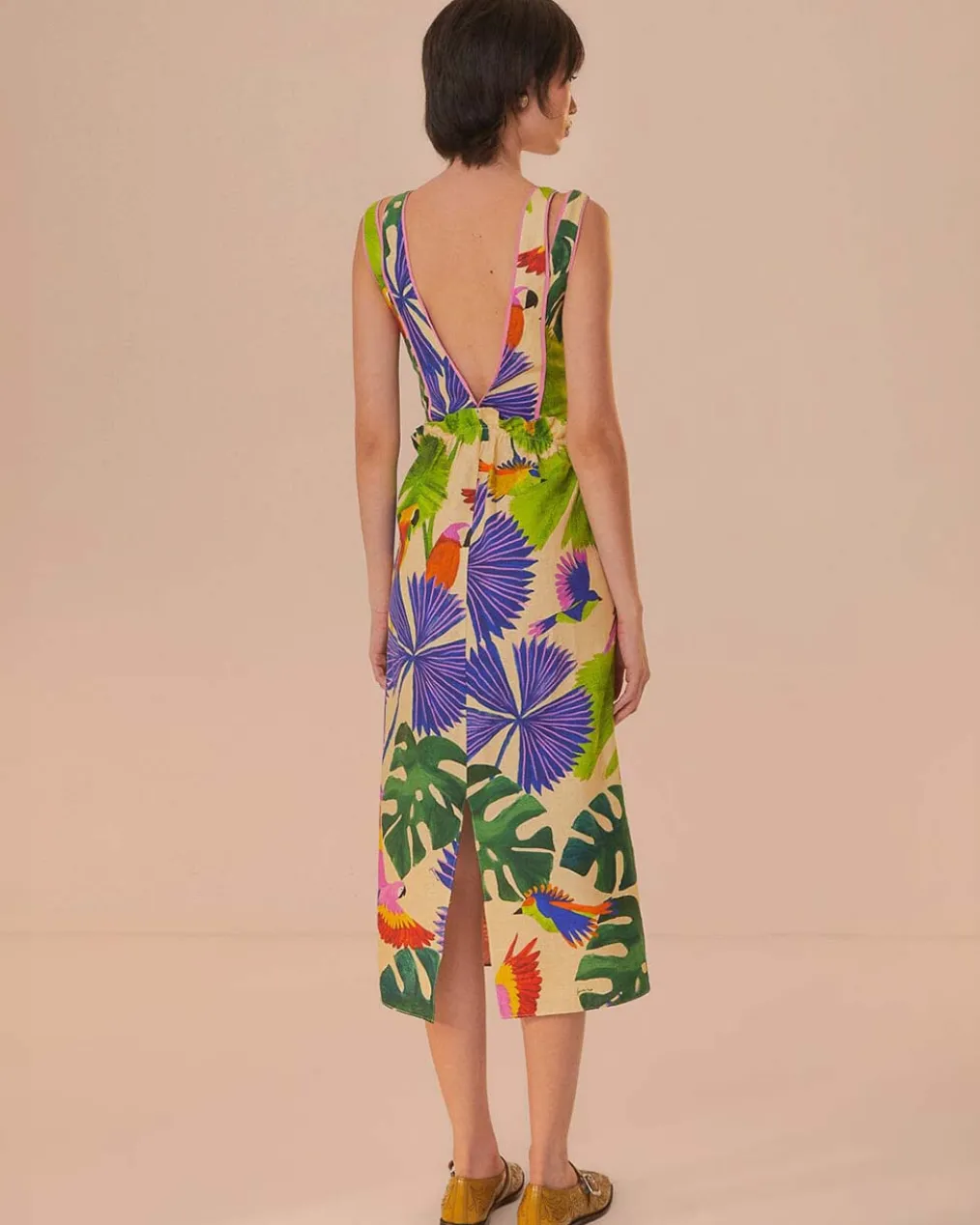 Embrace the vibrant energy of Brazilian forests with the Macaw Jungle Sand V Neckline Midi Dress. The flattering V neckline complements the flowy silhouette, while a lush print of tropical leaves and macaw parrots dance across the fabric. Earthy sand-hued backdrop sets the stage for dazzling purples, greens, and bursts of sunset orange. This enchanting midi dress is a canvas that celebrates the spirit of nature’s artistry.