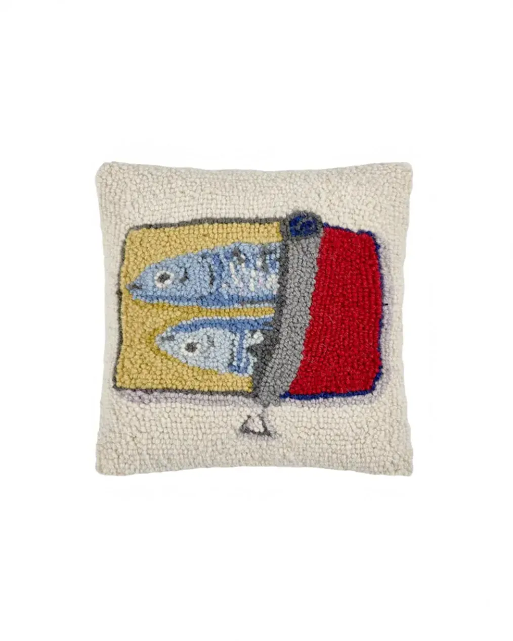Cuddle up cozy and tight with this adorable hooked wool sardines in a can pillow. A fun and whimsical addition to any interior, the sardines pillow will bring a smile to any tinned fish lovers face!