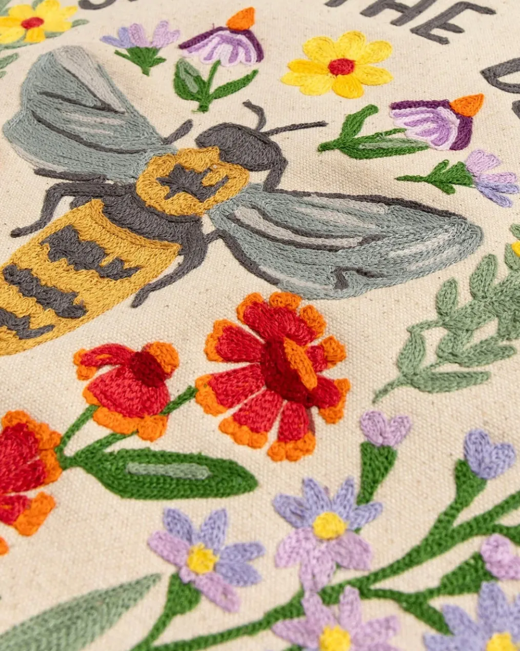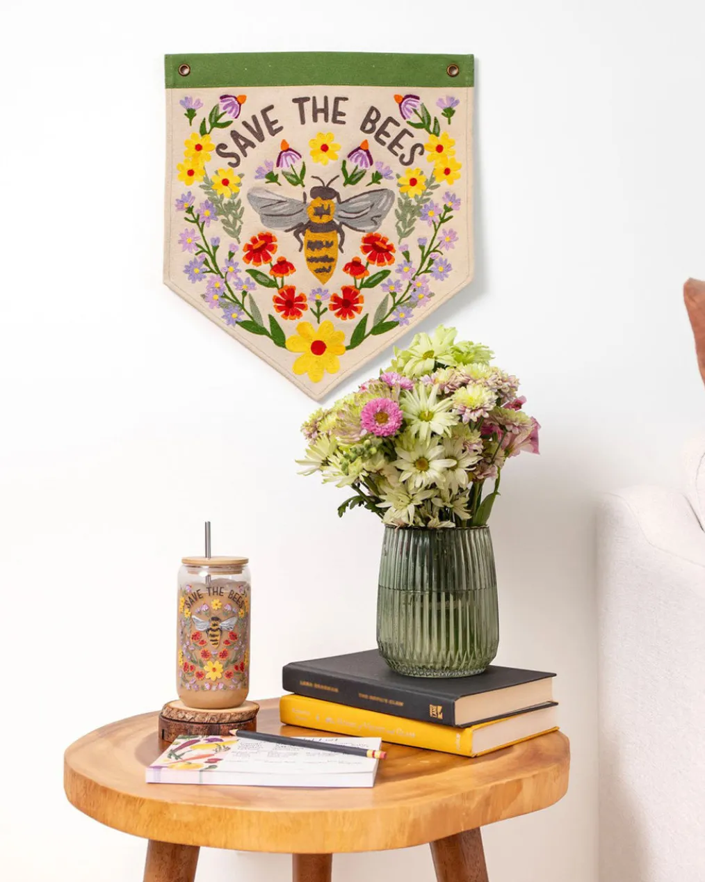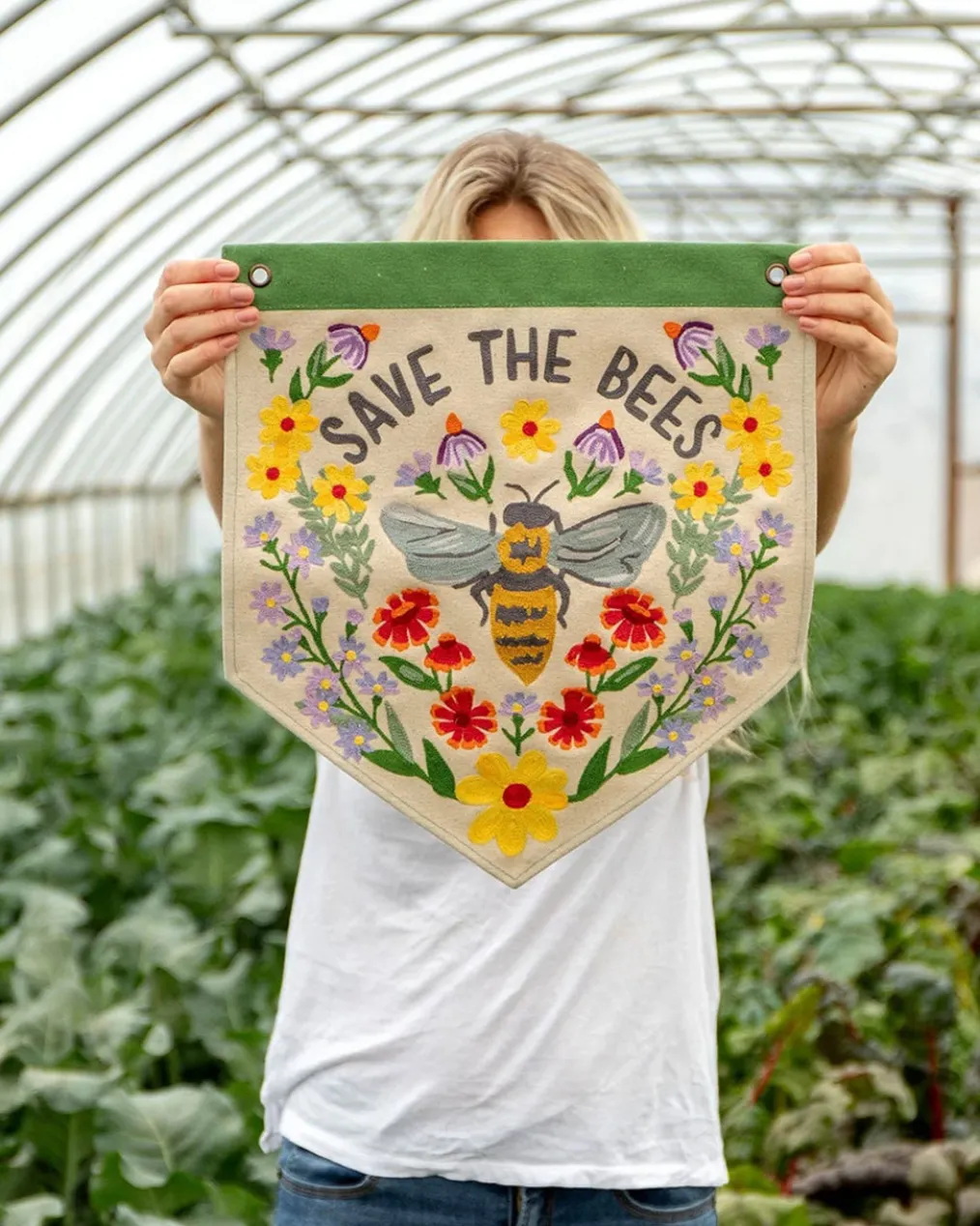 Elevate your space with the Save The Bees Embroidered Canvas Banner. This hand-illustrated, visually striking flag is perfect for bee enthusiasts, flower fans, and nature lovers. Featuring intricate chain-stitch embroidery, applique letters, and a canvas hem top edge, this home decor tapestry is sure to make a statement wherever it’s displayed.