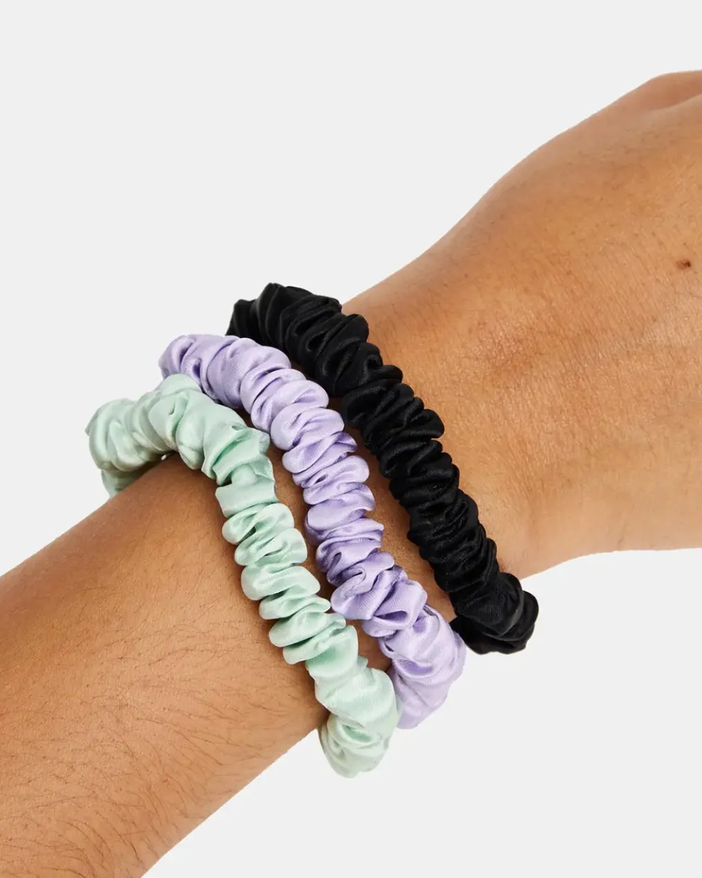 Made from 100% mulberry silk, this 3 pack of skinny scrunchies are perfect for all hair types and textures. Can be worn on the wrist and used like any hair tie.