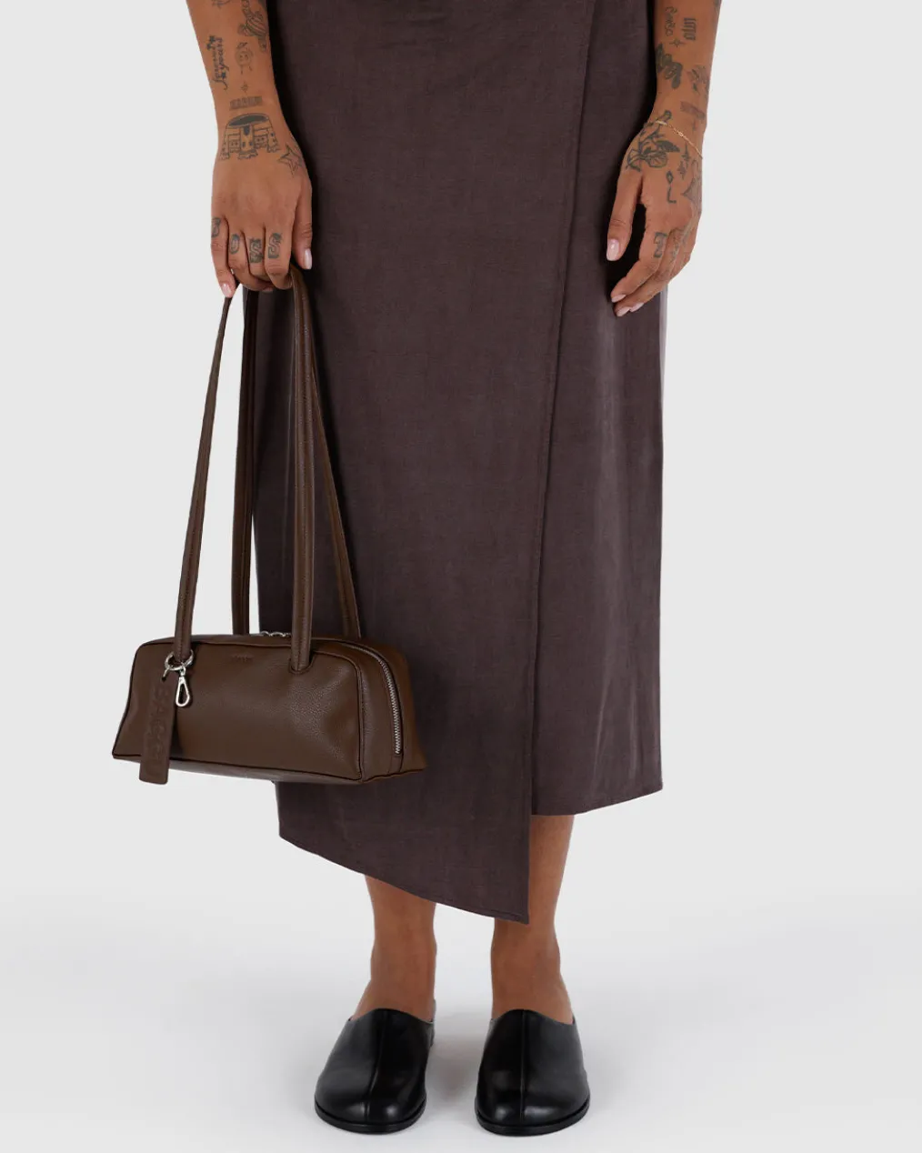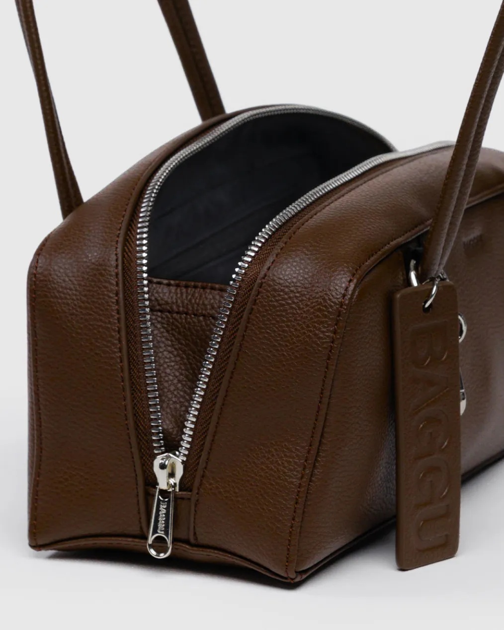A small recycled leather bowler bag designed to be accessorized, with four charm loops and a clip ring. An interior zip pocket keeps things secure and in reach. Fits your phone, wallet, keys, and more.