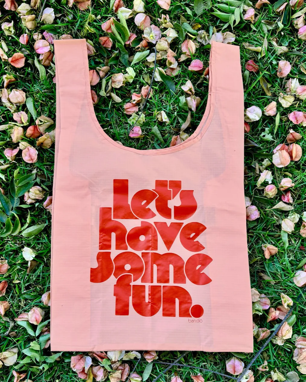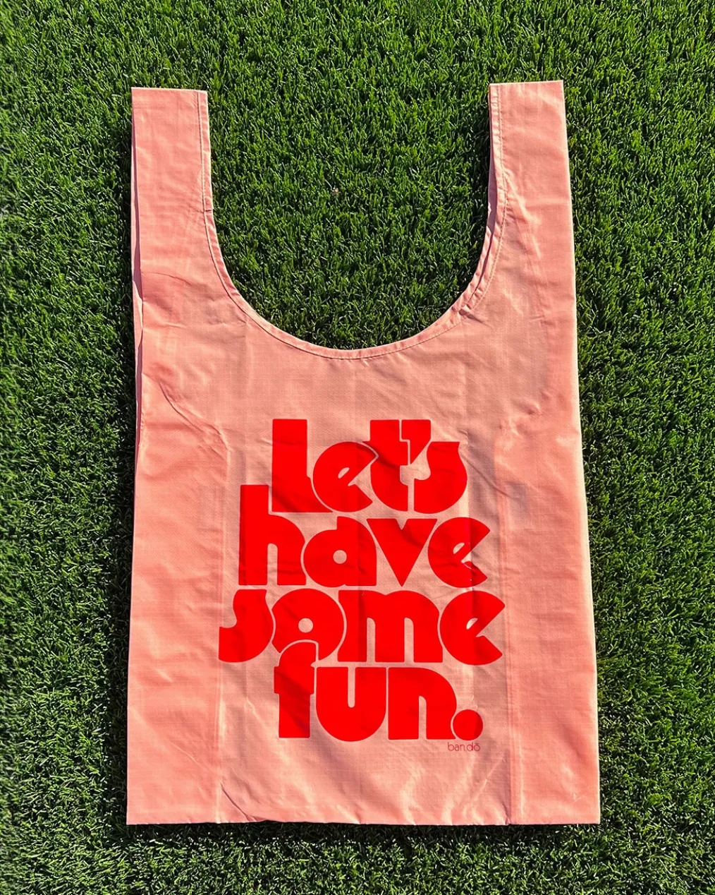 Q: What is super lightweight, can hold 50 lbs., and has a fun saying on it? A: This bag from Baggu! Seriously, it can hold fifty pounds. That’s like two and a half watermelons. (FYI: We looked that up. We didn’t know a watermelon’s weight offhand.)