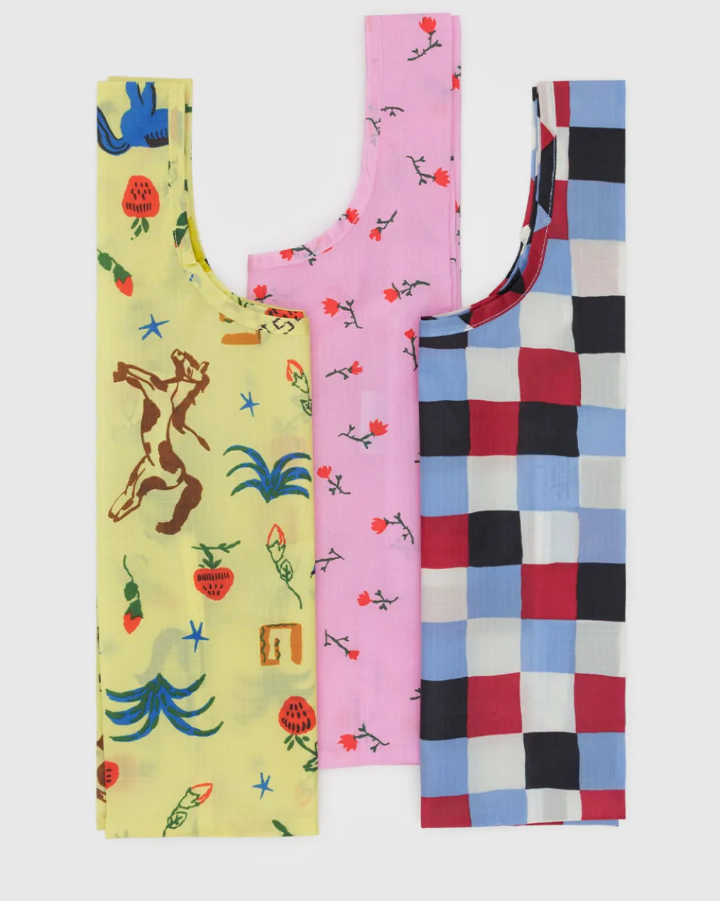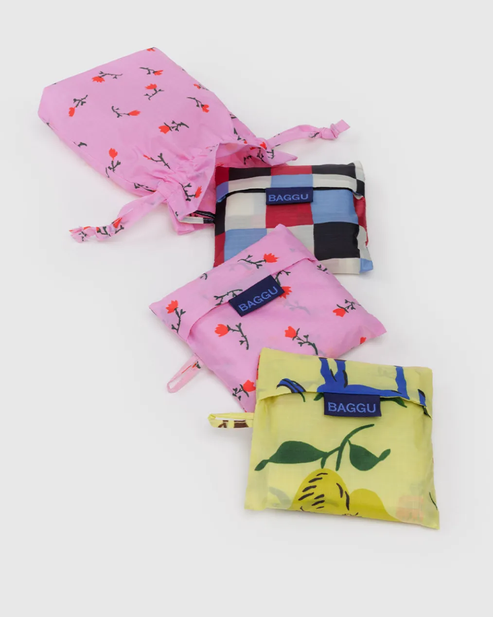 A set of Standard Baggus in a reusable drawstring pouch. Each set contains three unique prints, ideal for gifting.