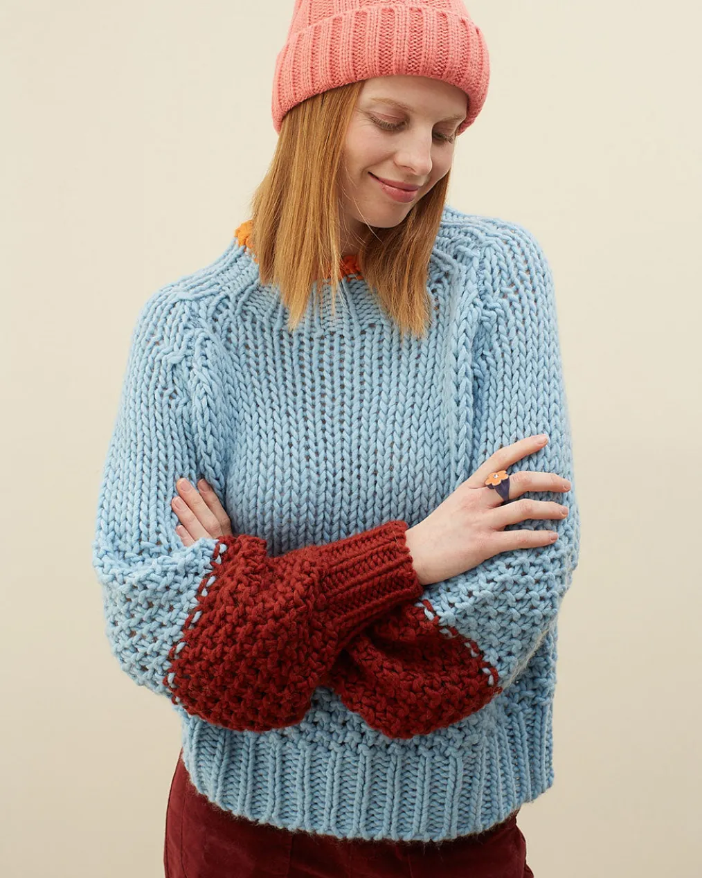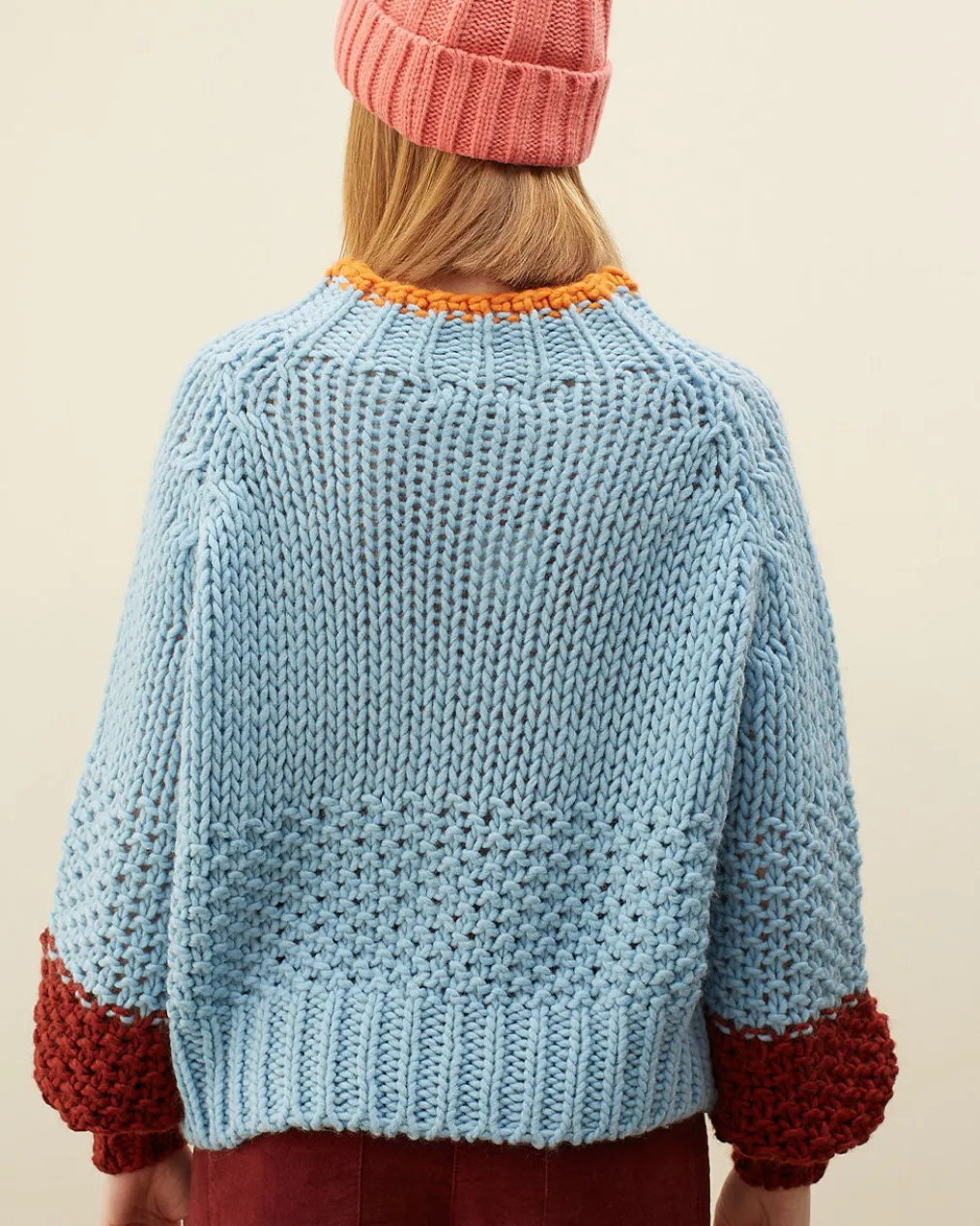 Tricolor sweater with wide sleeves. Straight and short cut with raglan sleeves. Dotted mix detail. Contrast color balloon sleeves.