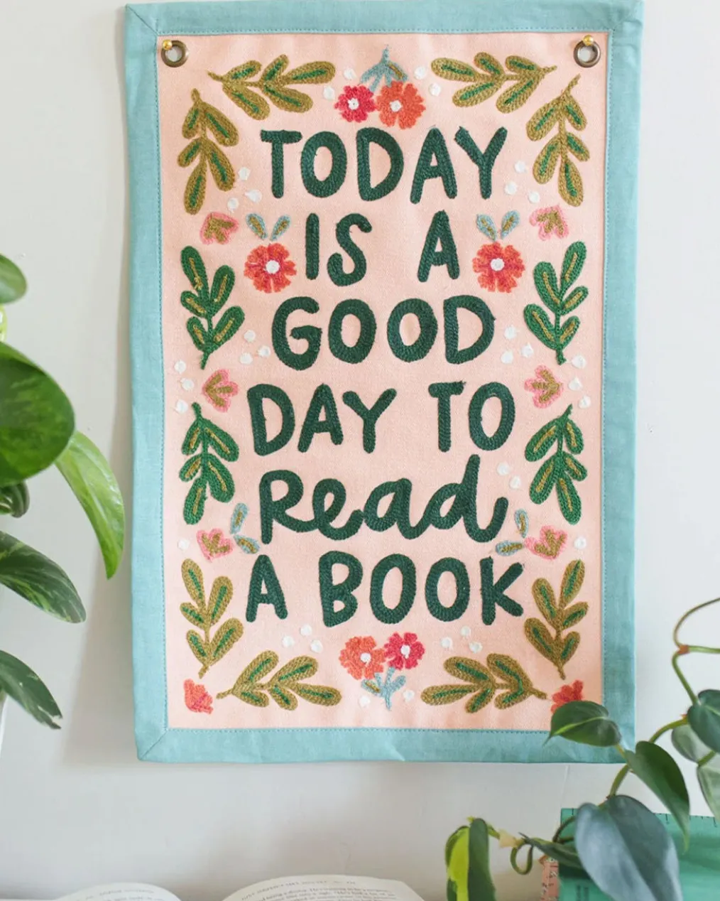 Enhance your reading space with othe Today Is A Good Day To Read a Book Embroidered Canvas Banner! Crafted with detailed chain-stitched embroidery on durable canvas, this banner radiates literary inspiration. Complete with brass grommets and a canvas hem edge, its effortless to display in a teacher’s classroom or a cozy home reading corner. Ideal for book lovers, educators, or anyone who loves literary decor, this banner makes a wonderful gift for birthdays, teacher appreciation, or housewarmings. Invite the joy of reading into any environment with this charming and uplifting decoration!