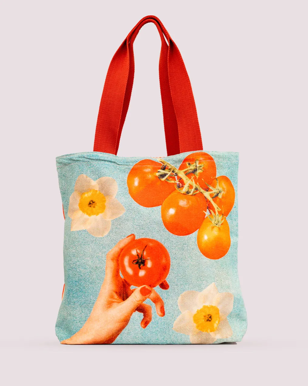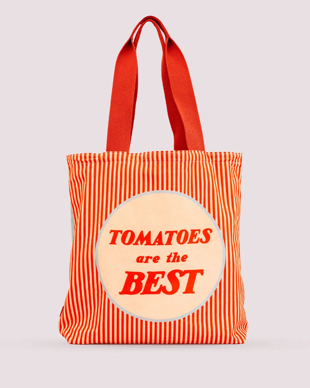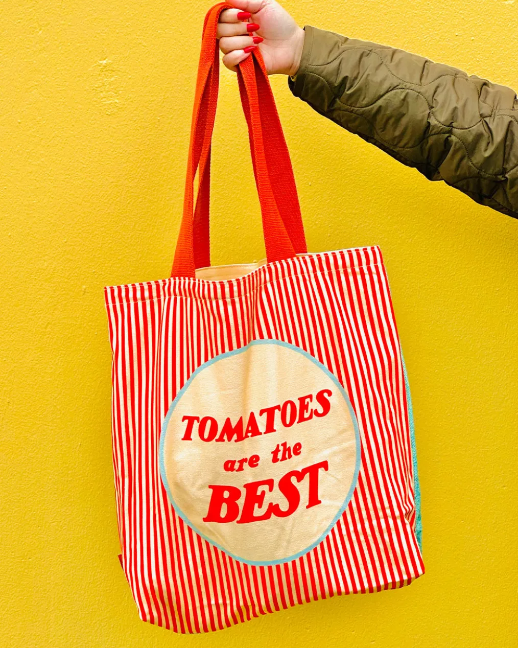You have a statement to make and it’s definitely about tomatoes. This cool canvas tote features a double-sided design and interior pocket.