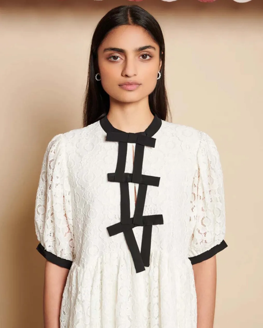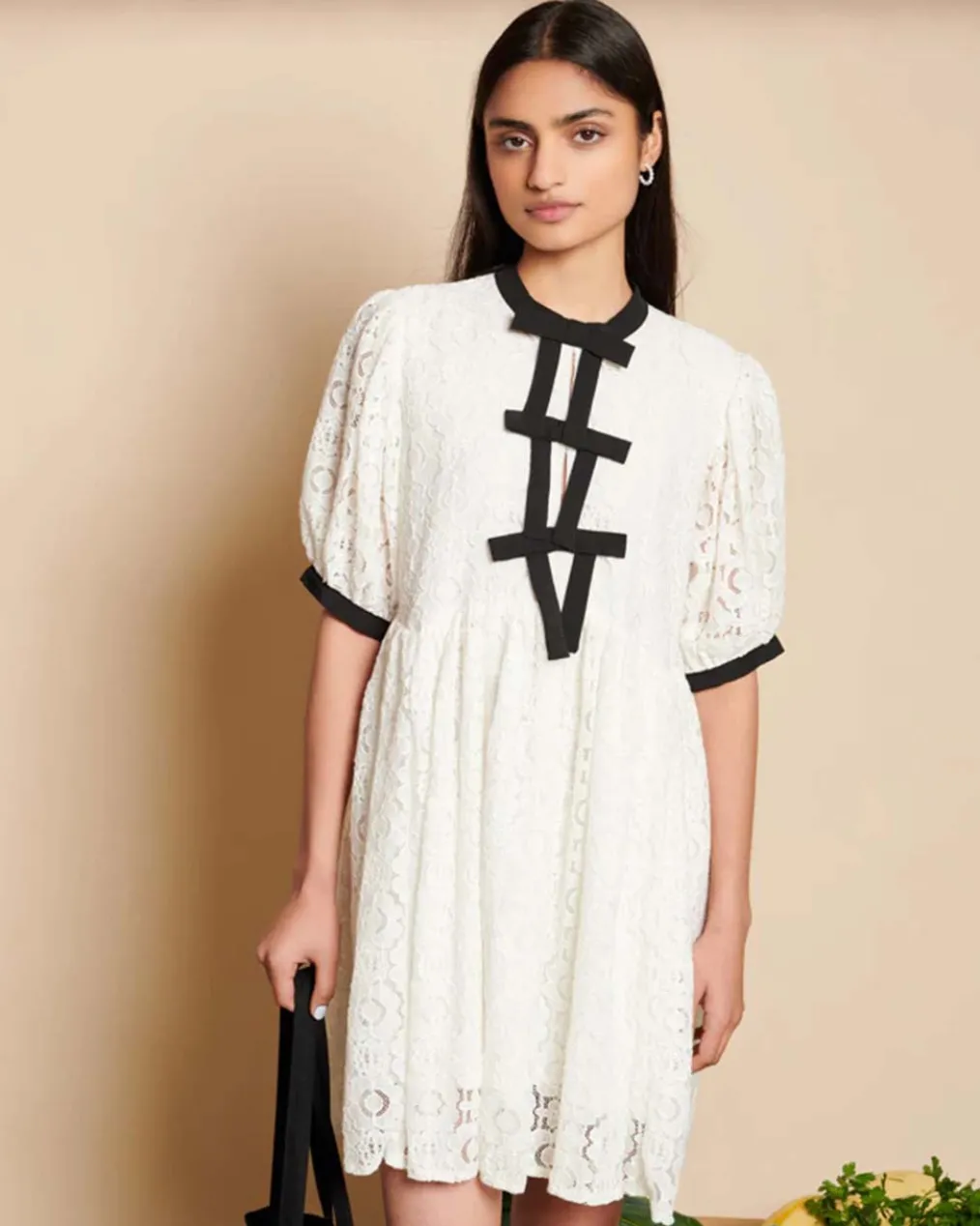 Indulge in the ethereal elegance of the Vanilla Lace Mini Dress, a vision of delicate femininity crafted from floral lace fabric. Its oversized silhouette exudes charm, adorned with contrasting gros grain trim and bows that add a touch of trendy allure. This luxurious lace ensemble is a captivating choice, perfect for leisurely outings to the market or enchanting rendezvous.