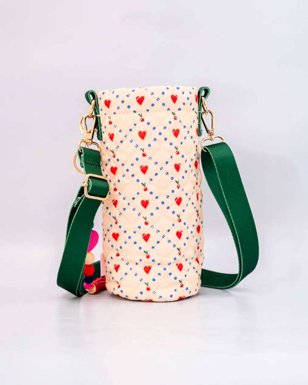 When your water bottle wants to go undercover. This sling has a toggle closure, adjustable strap, and front pocket with a li’l beaded charm.