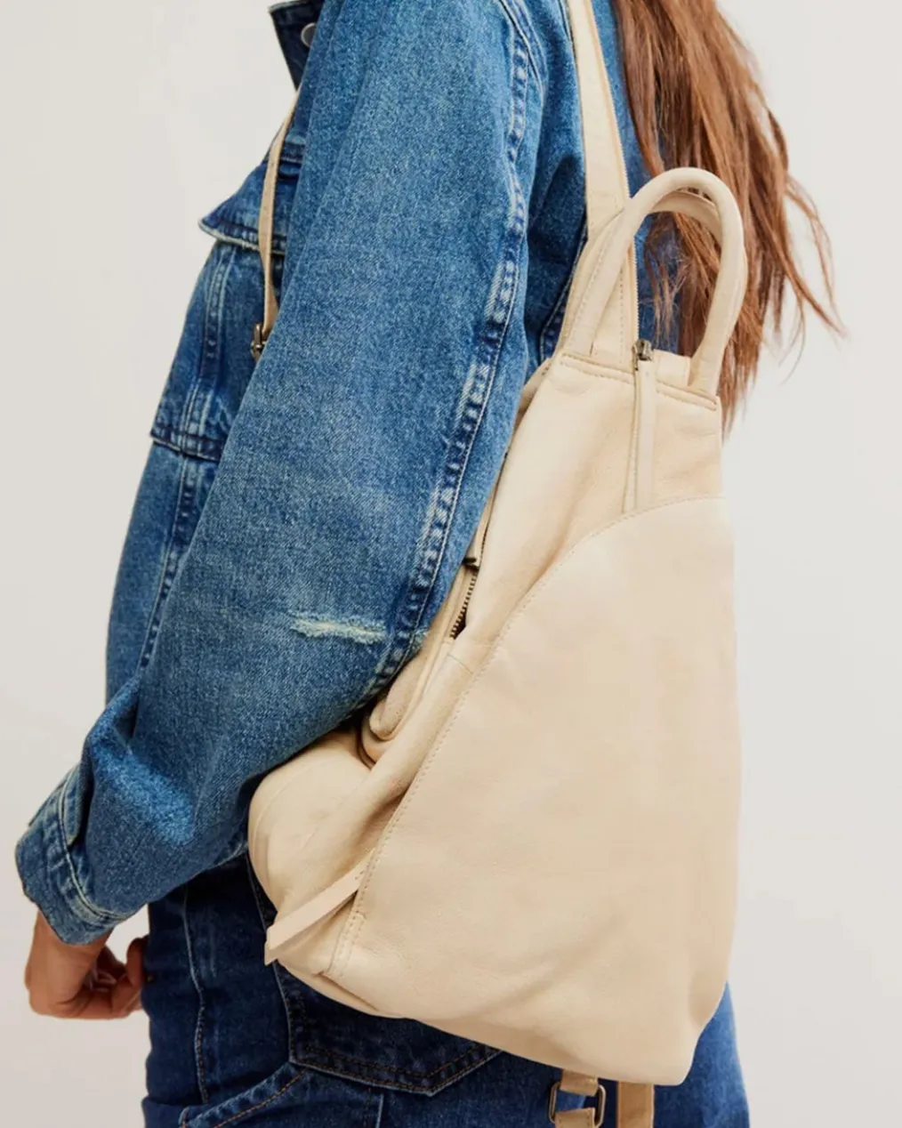 Designed to be slung over your shoulder or styled as a backpack, this soft leather sling bag from theWe The Freecollection features zippered details and defined top handles for added classic shape