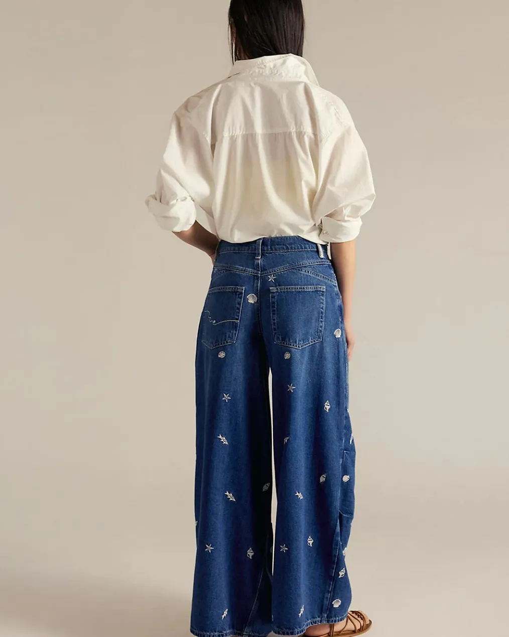 - Button fly closure, five-pocket design, tucked pleating at the knees, premium soft drapey denim, nautical embroidery throughout