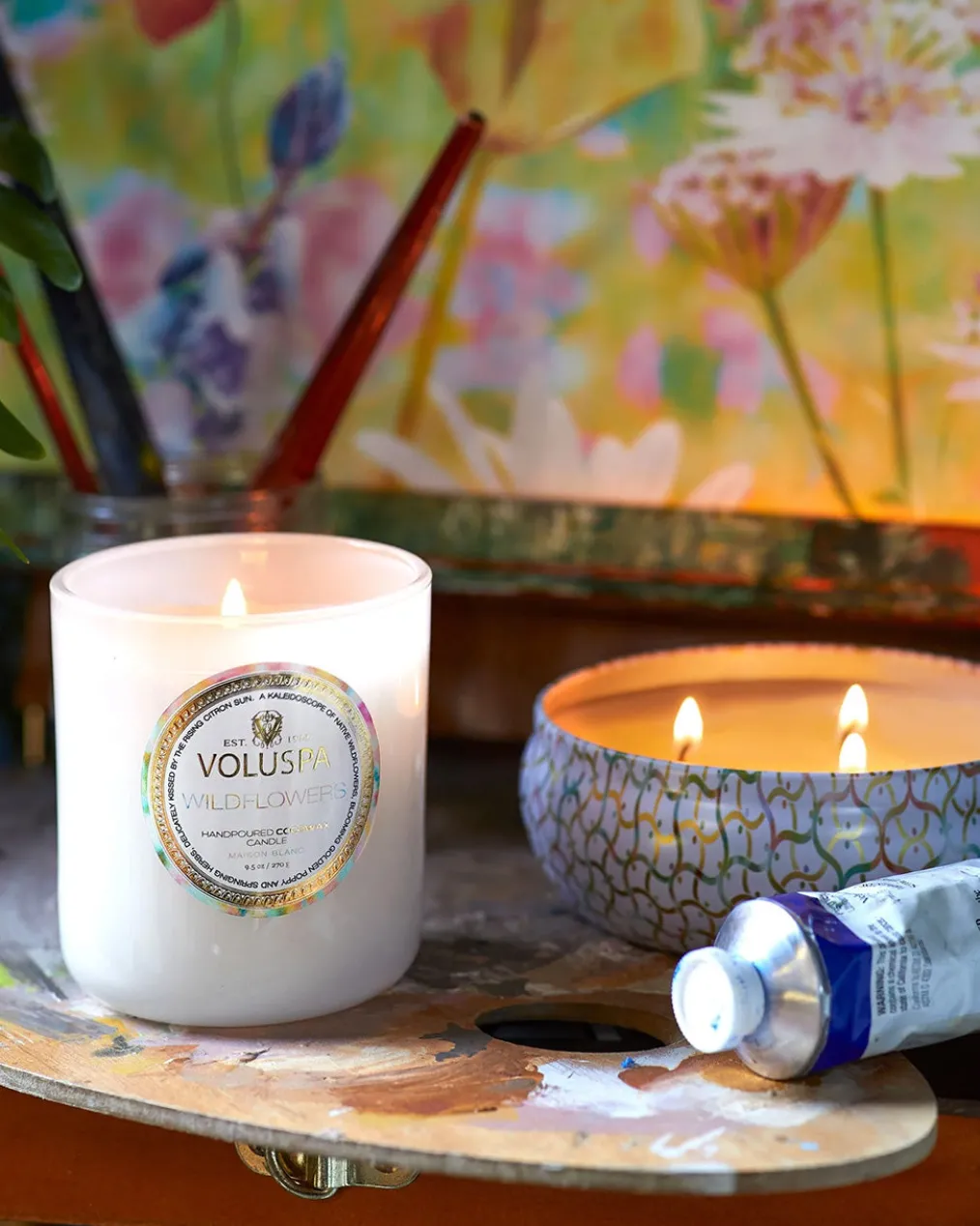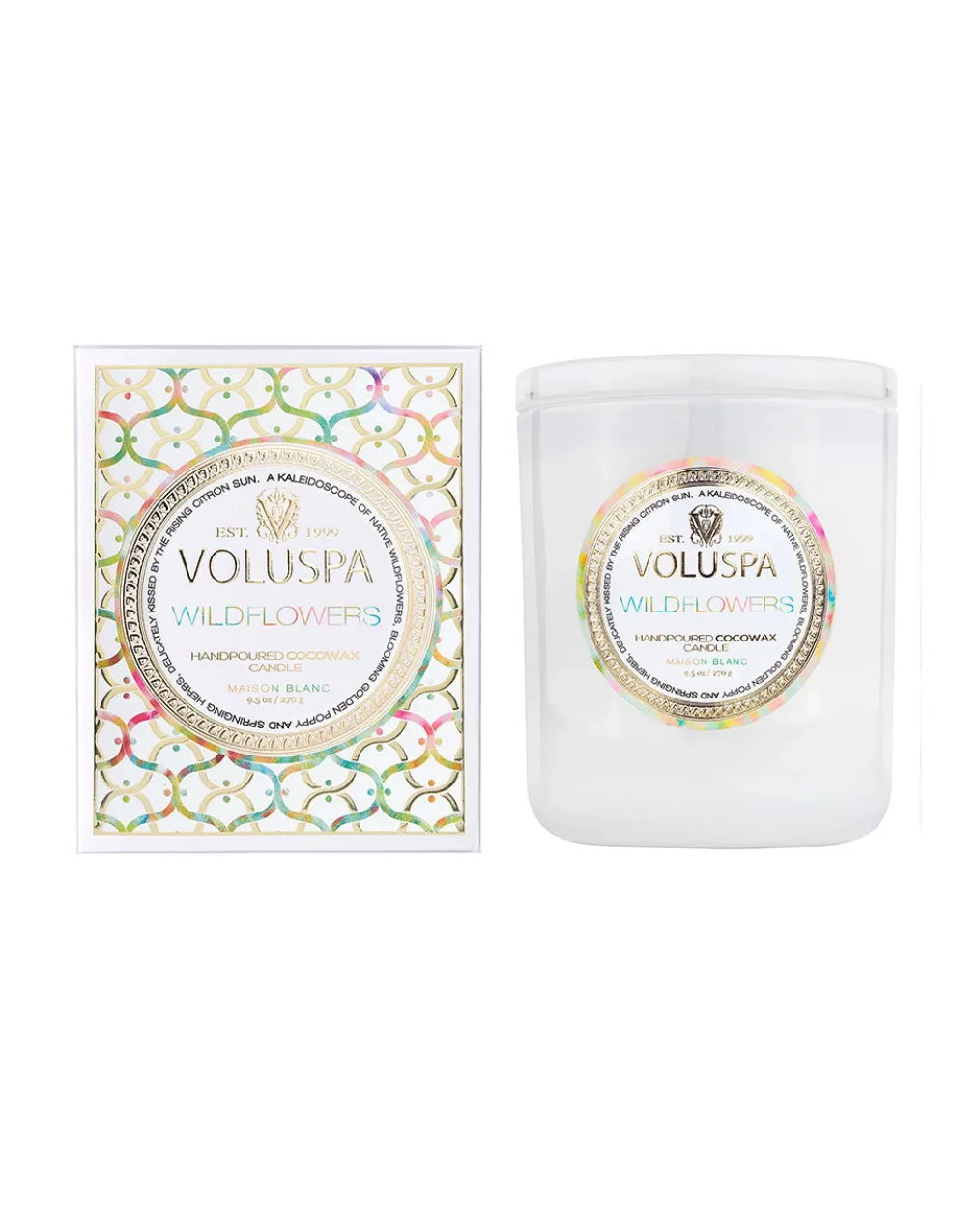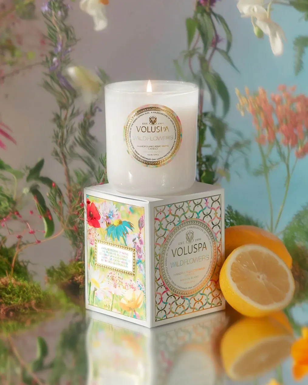 You’ve been called to dance among the wildflowers, losing yourself in the beauty of this unruly floral sea. Lightly pass your hand over a kaleidoscope of Native Wildflowers, blooming Golden Poppy, Ambrosia and springing Herbs; sugared by misty vapors of Blue Agave and delicately kissed by the rising Citron sun. Gently coax this fragrant super bloom of Voluspas Wildflowers.