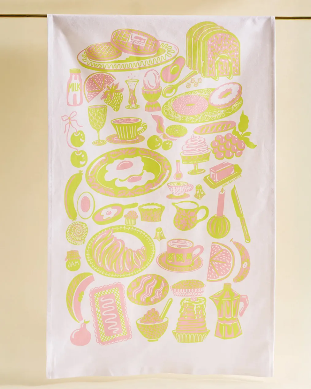Covered in a delightfully illustrated spread of all your brunch faves—think waffles, eggs, donuts, croissants, and coffee galore—this towel is a playful ode to the most important meal of the day.