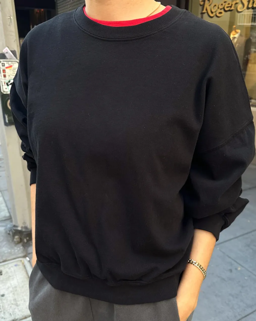 The Cali Jersey Sweatshirt blends the best of The Little Boy Tee and the Poche Top for a playful take on the classic crewneck. Crafted from 100% premium cotton jersey, it offers the lightweight feel of the Little Boy Tee, making it ideal for layering under jackets. It also borrows signature details from the Poche Top, like a ribbed crew neckline and relaxed balloon sleeves. Designed with a slightly oversized fit, it features a perfectly cropped length, creating the perfect balance of style and comfort.