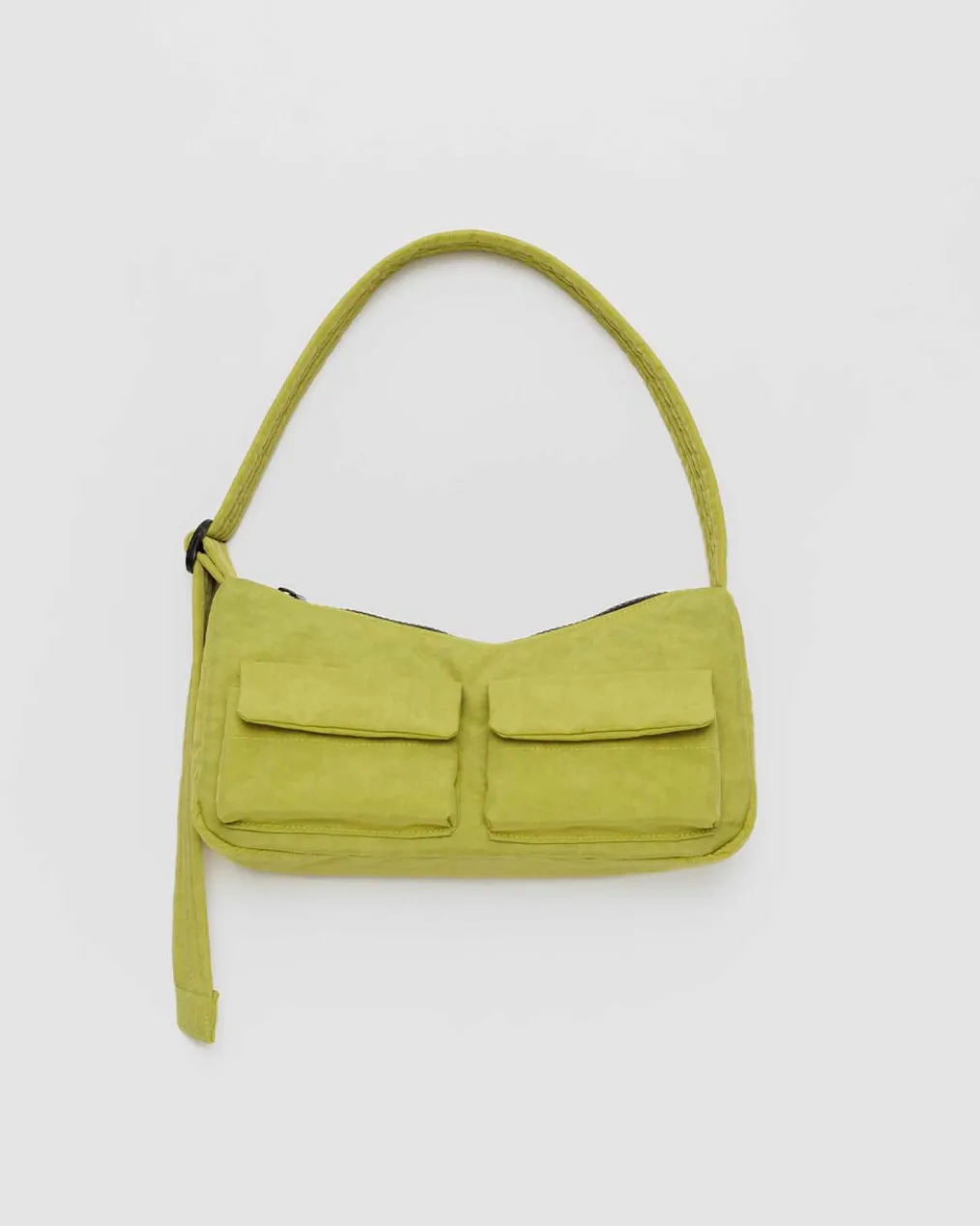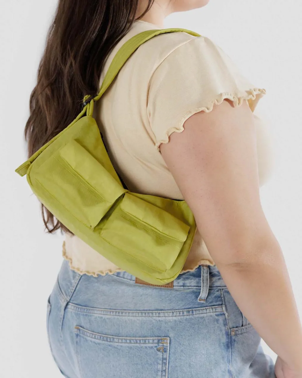 A baguette style purse with two external flap pockets for easy access to your essentials.