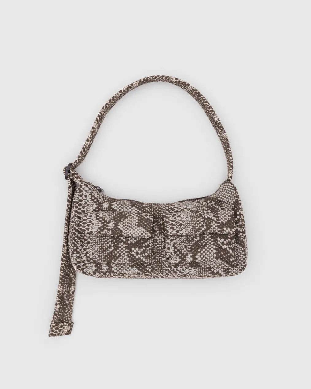 A baguette style purse with two external flap pockets for easy access to your essentials.