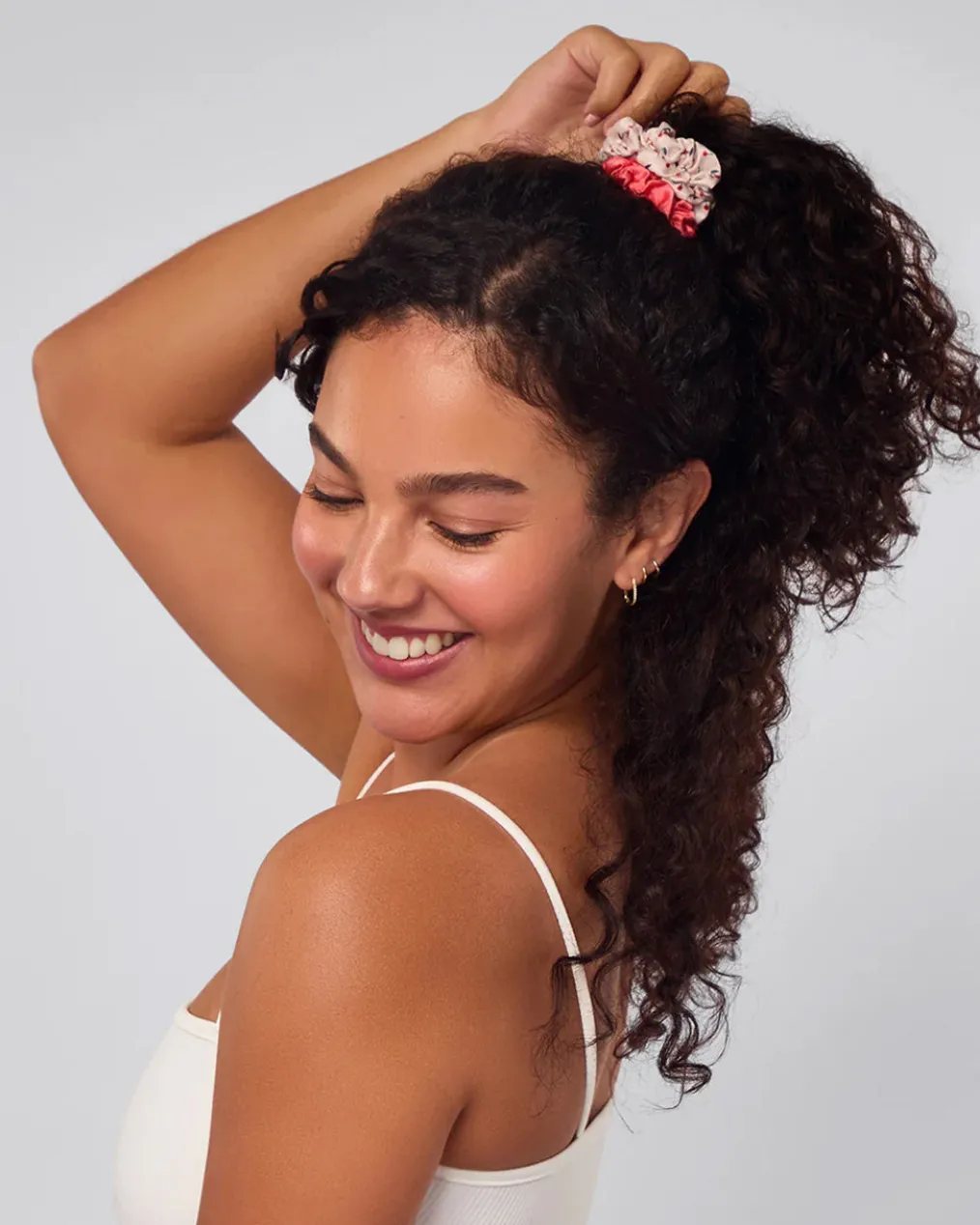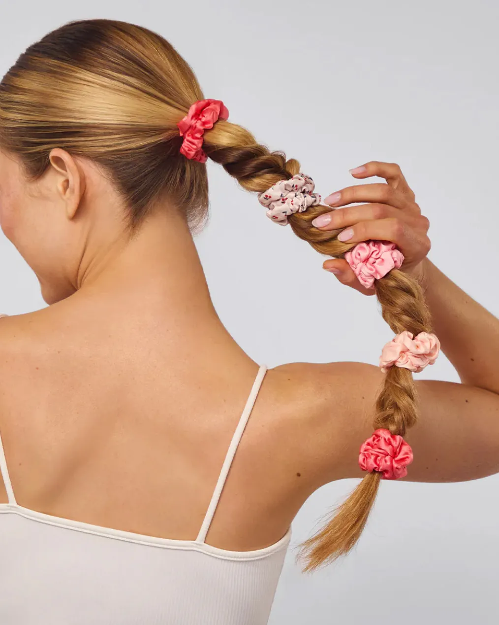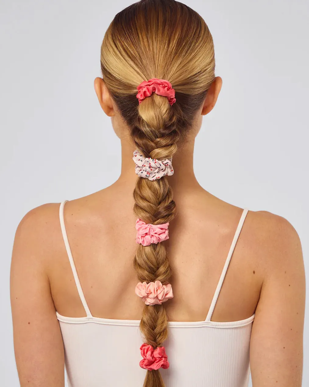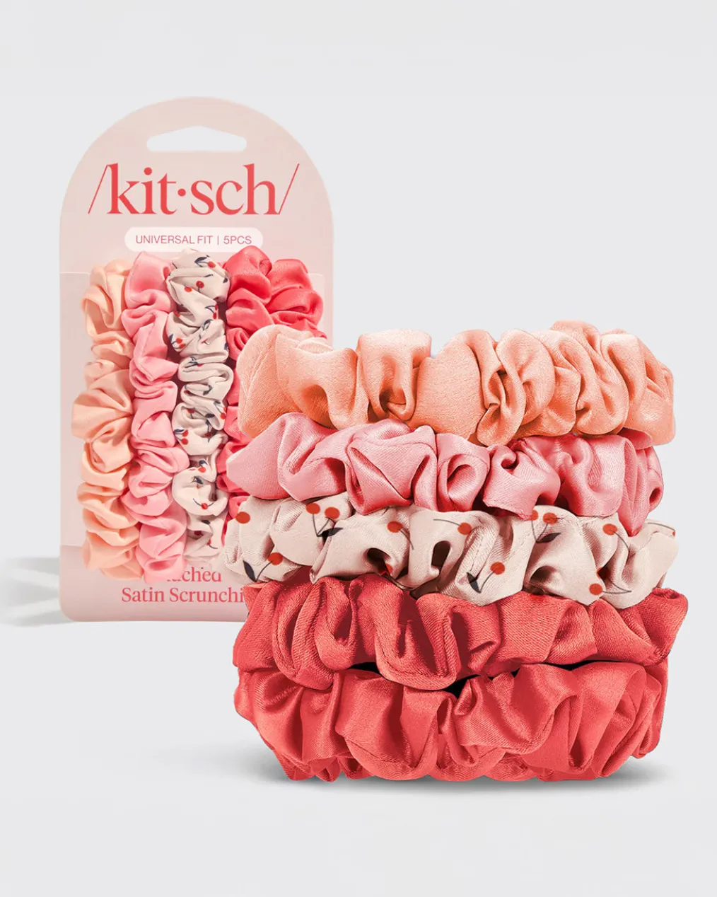 - Each package includes five satin scrunchies in assorted cherry-inspired and neutral tones.
