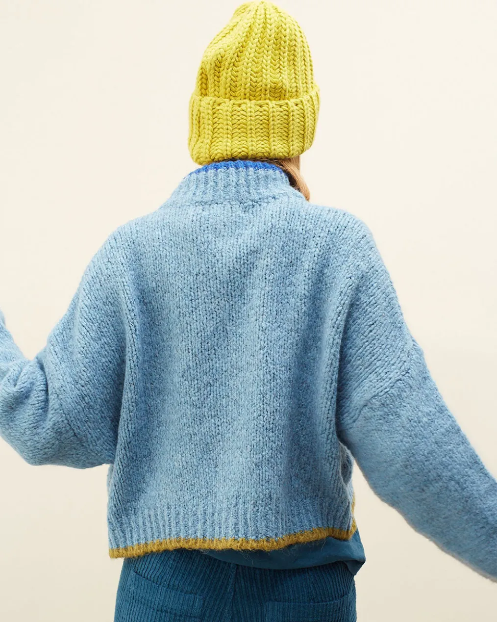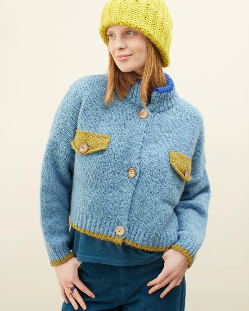 Short chunky knit cardigan with pockets. Straight cut and long sleeves. Wooden buttons. Chest pockets. Cowl collar. Contrast color details.
