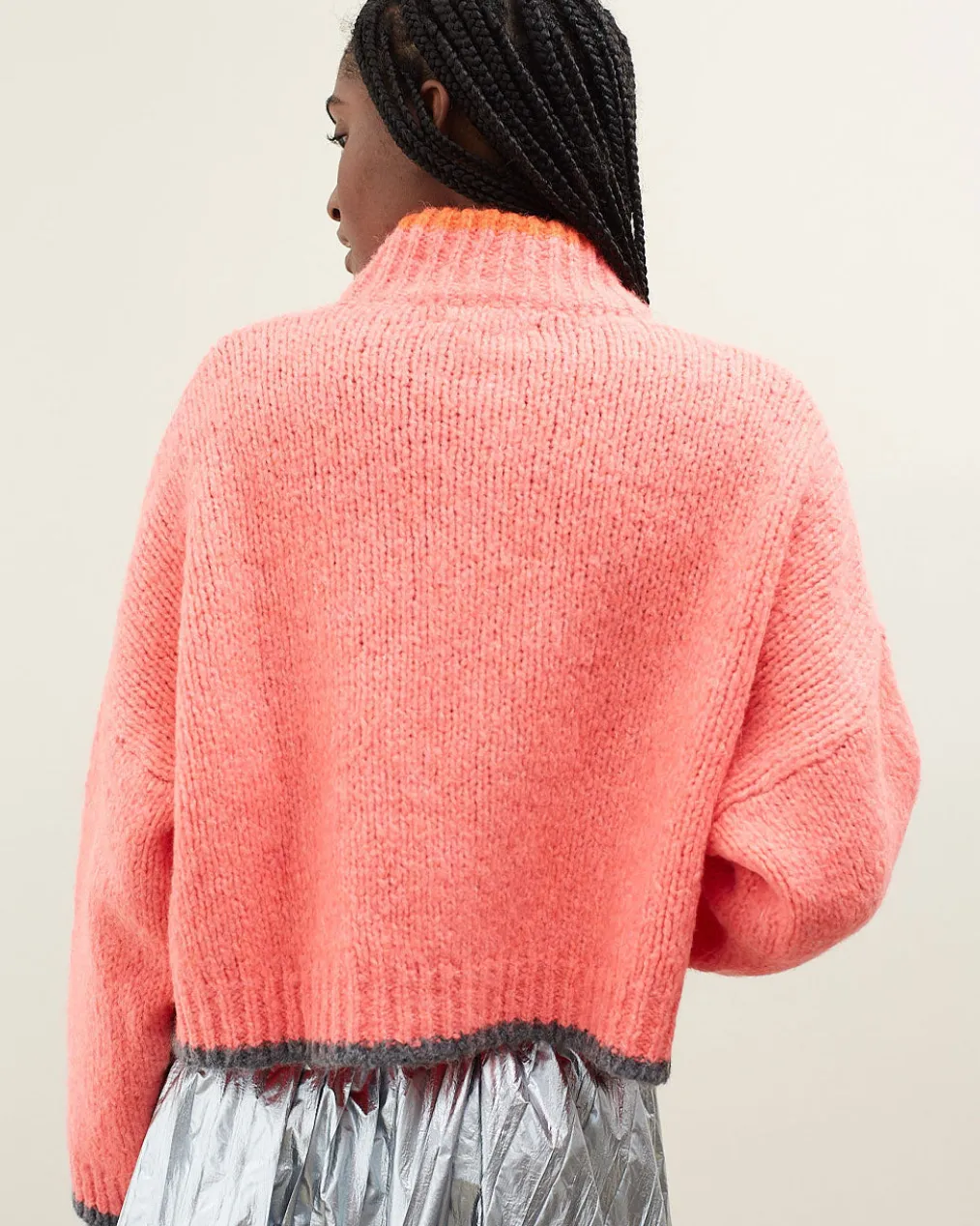 Short chunky knit cardigan with pockets. Straight cut and long sleeves. Wooden buttons. Chest pockets. Cowl collar. Contrast color details.