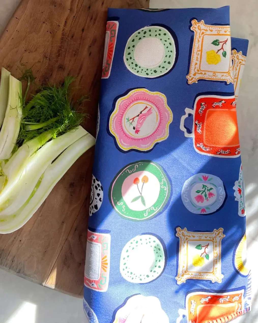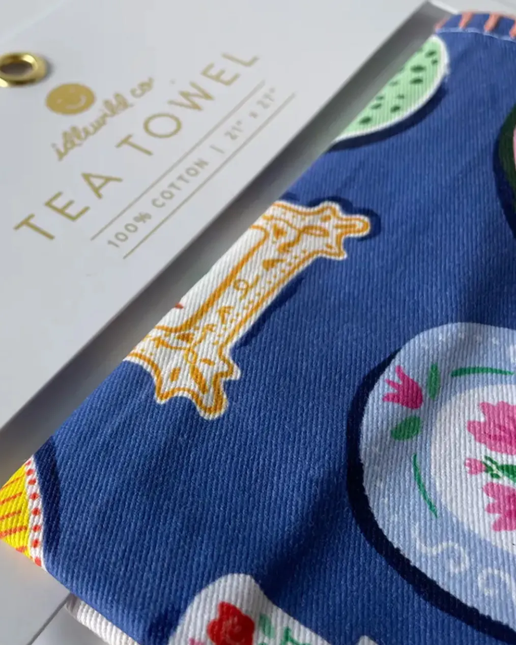 These vibrant tea towels are just the thing to add a touch of colorful flair to your kitchen, or a thoughtful hostess/housewarming gift! Woven from 100% absorbent cotton and printed with charming, hand-painted designs, each towel is embellished with contrasting embroidery along the seaming.