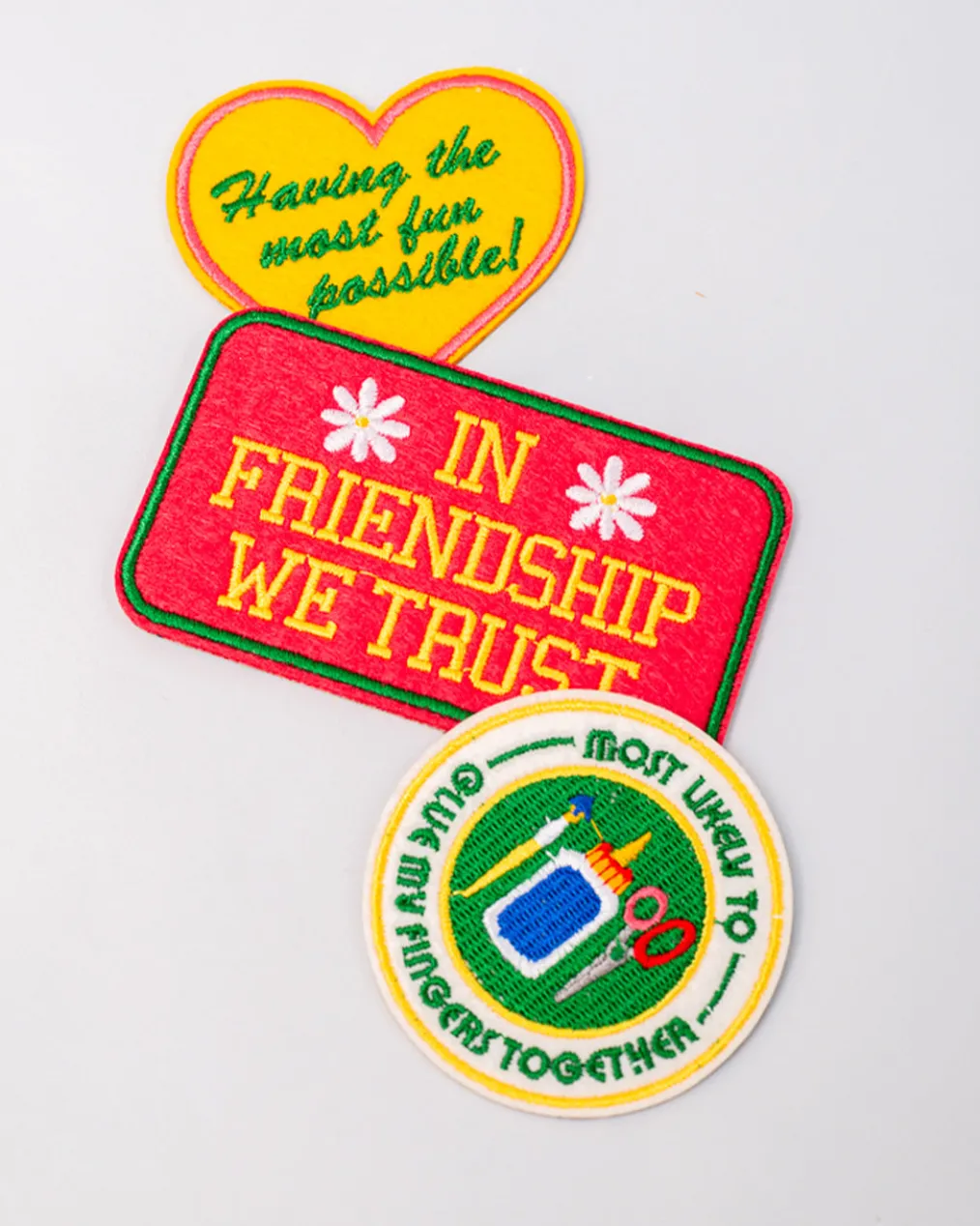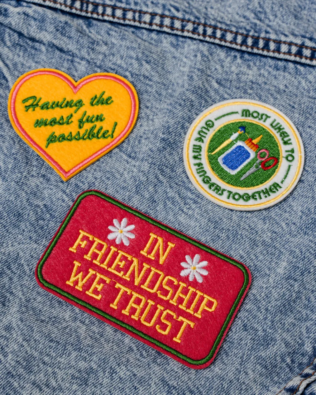 More summer camp vibes, please! This set of patches includes three unique embroidered designs, each with an easy adhesive backing.