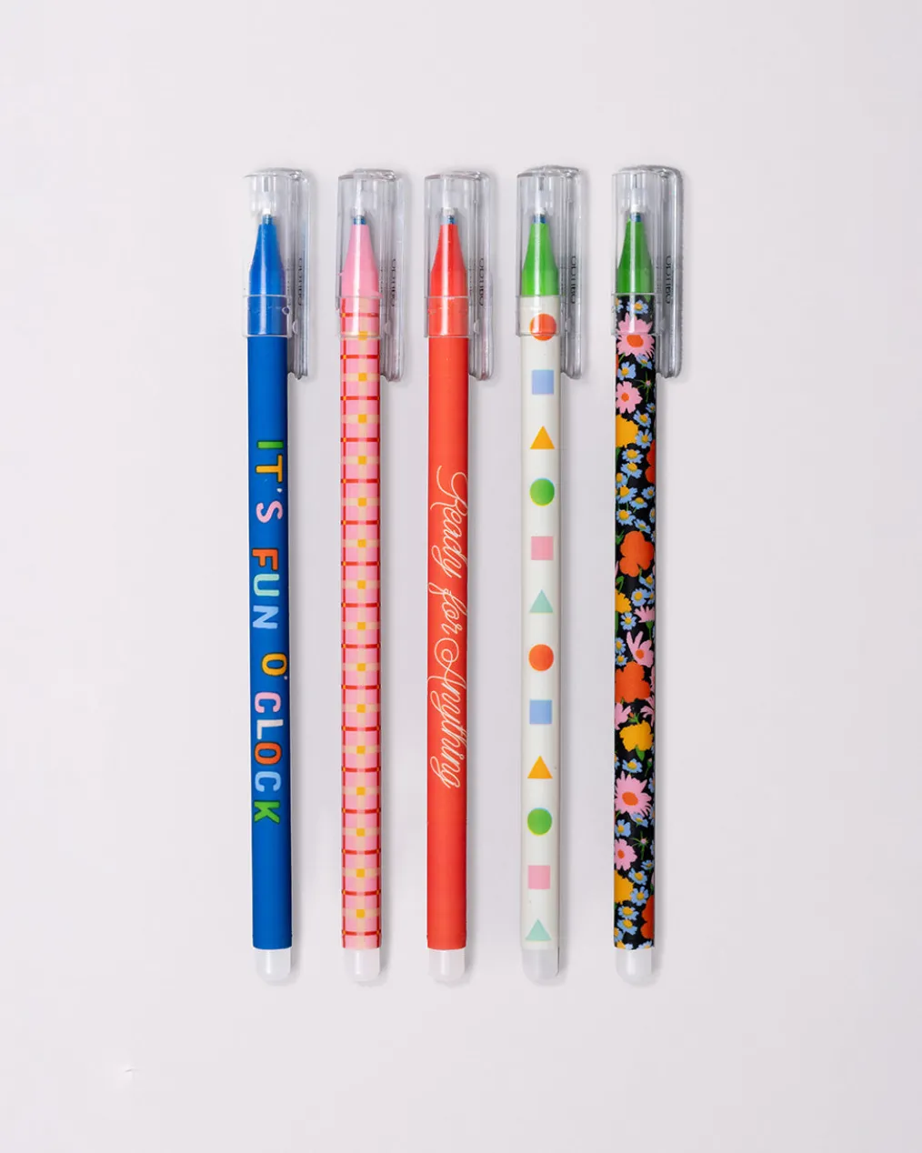 Erasable pens = the best of both worlds. This set features black ink, caps with clips, and five unique designs.