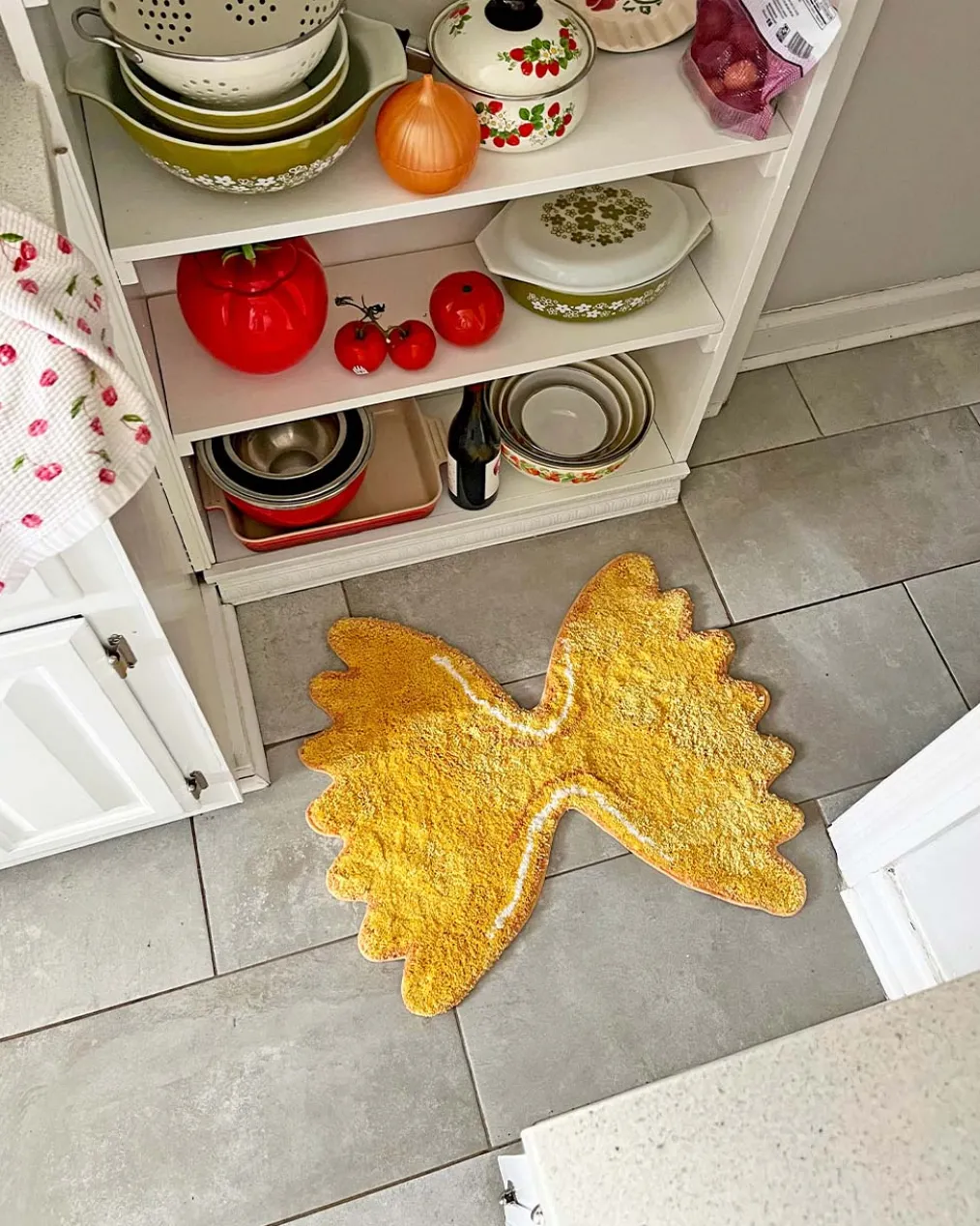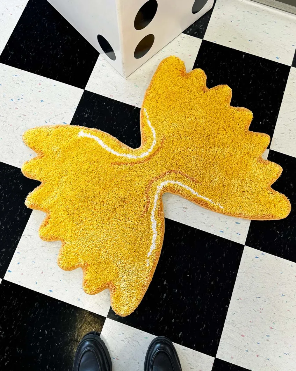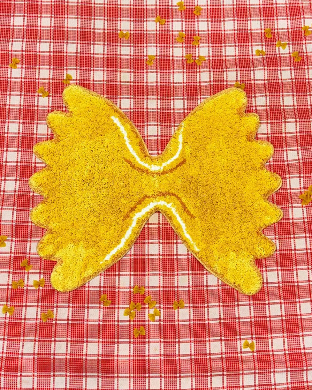 Forever craving a bowl of buttered noodles. Shaped like bowtie pasta, this rug will go perfectly as home decor, whether you use it as a rug or hang it on the wall!