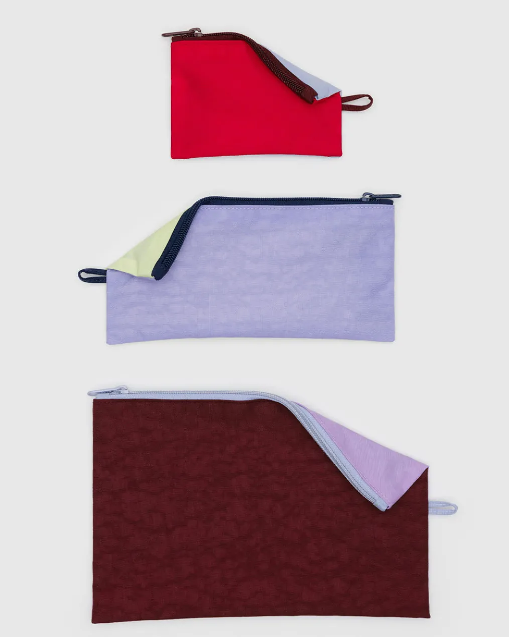 Pouches with possibilities. From Baggu, this set of three is made with a machine-washable nylon and each has a zip closure.