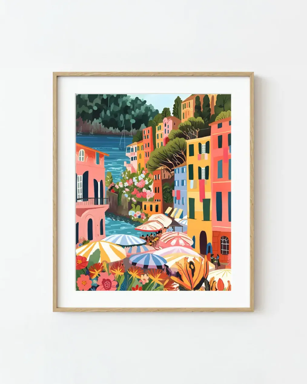 Flower Market: Portofino is a Mediterranean daydream — a whimsical escape to the Italian Riviera where striped umbrellas dot the coastline, sailboats float on sapphire waters, and sun-washed buildings bloom with flowers. It’s bold. It’s vibrant. It’s vacation on canvas — and part of the unforgettable new Flower Market Collection.