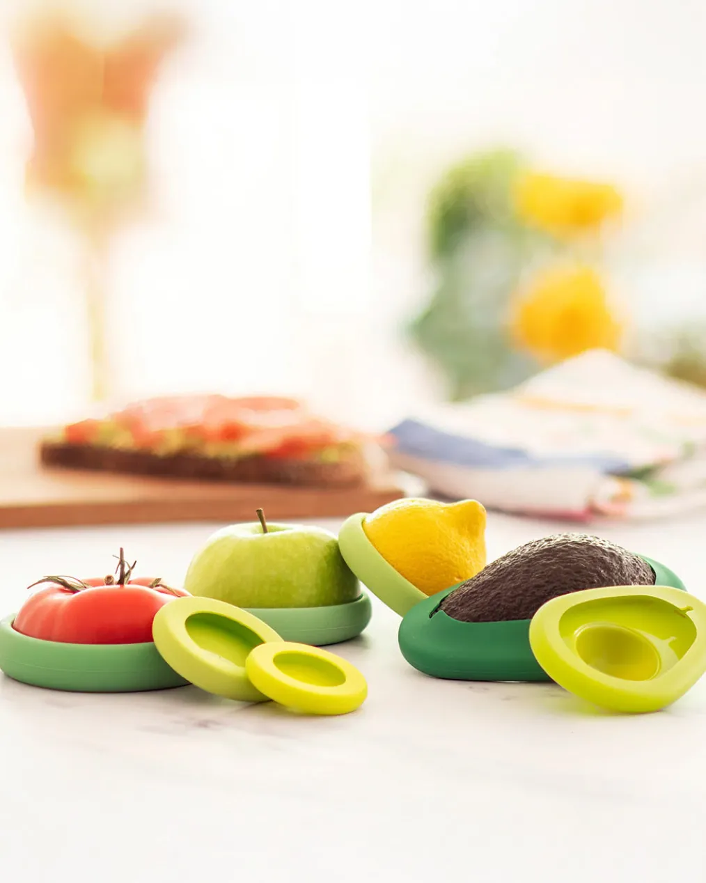 - A set of five snug, reusable covers in a variety of sizes, designed to fit your fruits and vegetables, as well as jars and cans. These durable huggers create an airtight seal to lock in freshness and flavor.
