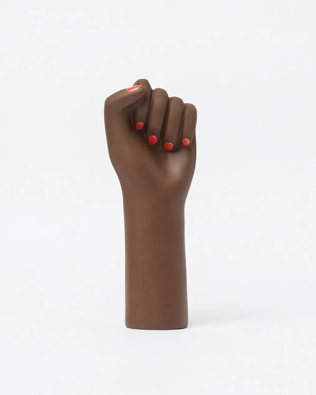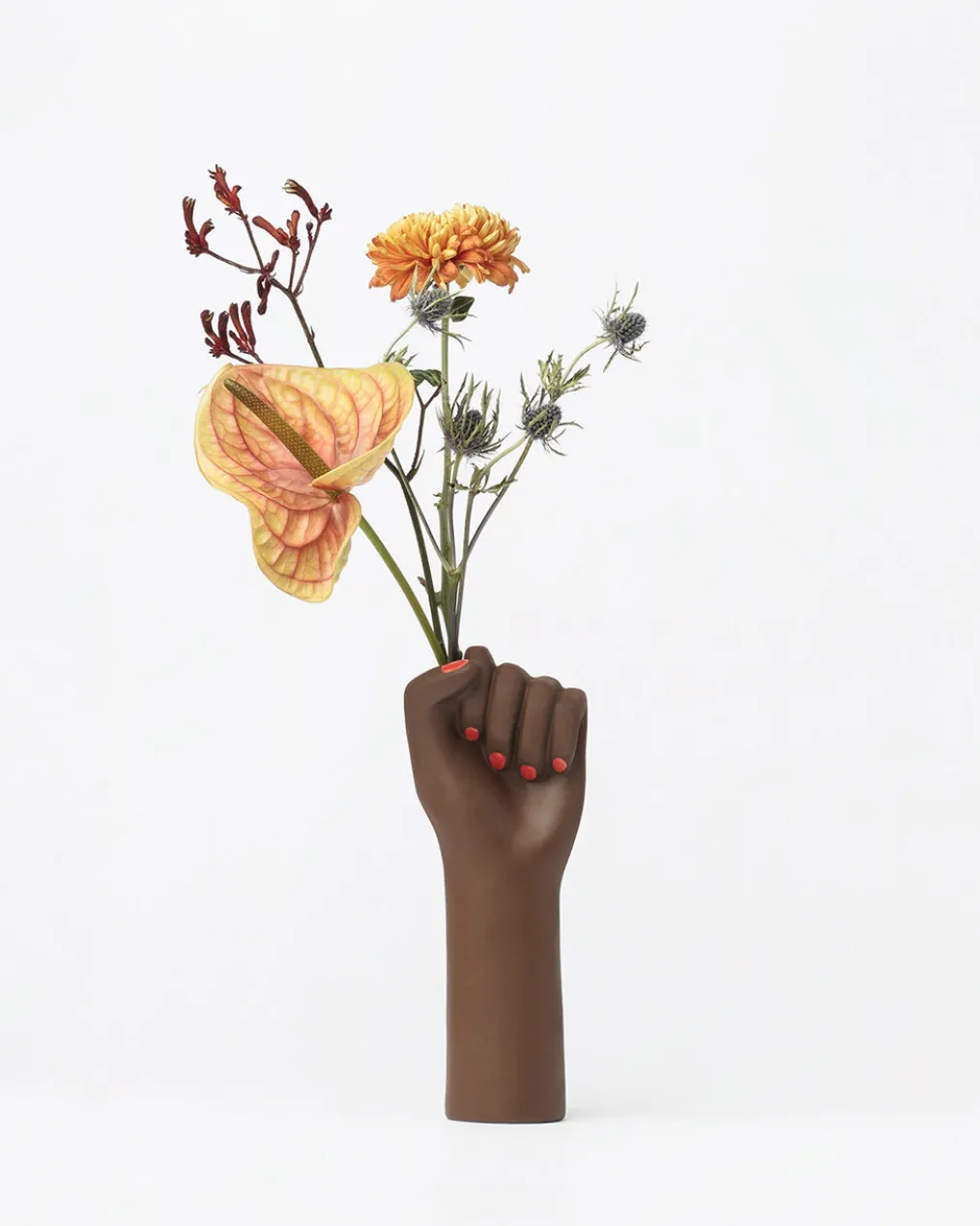 Modern ceramic vase with matte finishing shaped as a fighting woman’s hand, with painted red nails. A symbol of resilience, bravery and strength. Copyright @allwomankind / @devapardue 5% of the sales of the products will be donated to actively help female empowerment through For All Womankind public benefit company.
