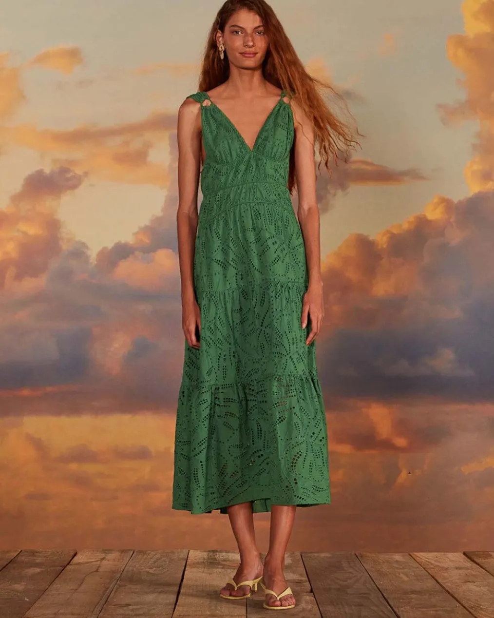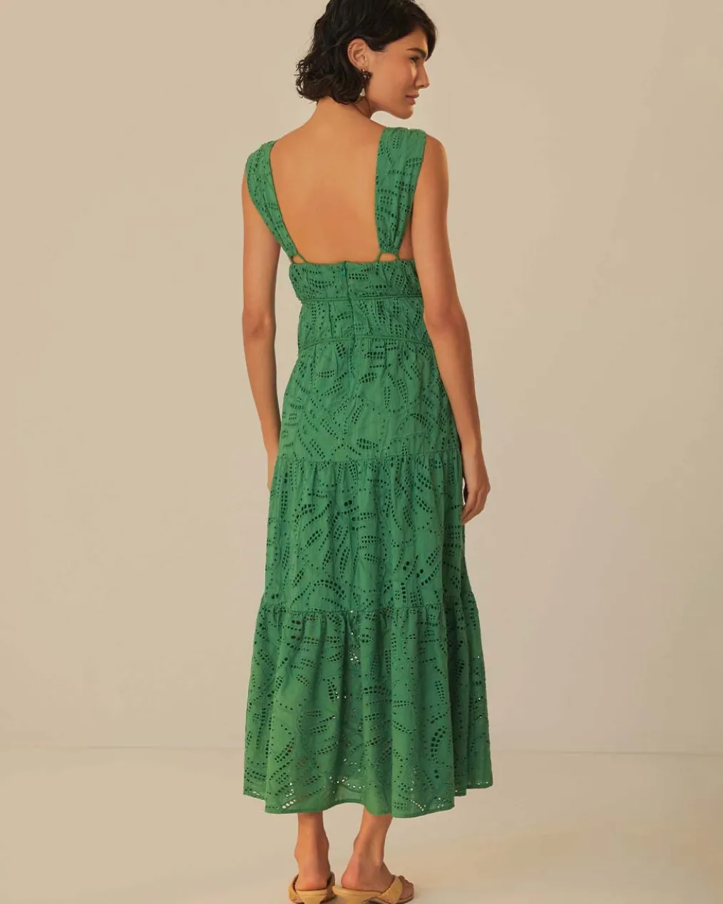 Embrace tropical elegance with the Green Monstera Corset Eyelet Maxi Dress, featuring an alluring V neckline framed by delicate ruffled straps. This eye-catching piece is adorned with intricate eyelet detailing that mirrors the beauty of monstera leaves, all in a lush shade of green. Its corset-style bodice and flowing tiered maxi skirt create a feminine silhouette that dances with every step, inviting you to lose yourself in the rhythm of nature’s own design.