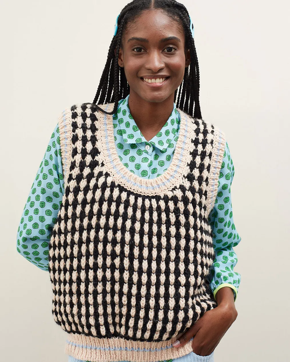 Handmade look vest in chunky knit. Bicolor fantasy stitch. Detail of fine contrasting color stripe on collar, armhole and hem.