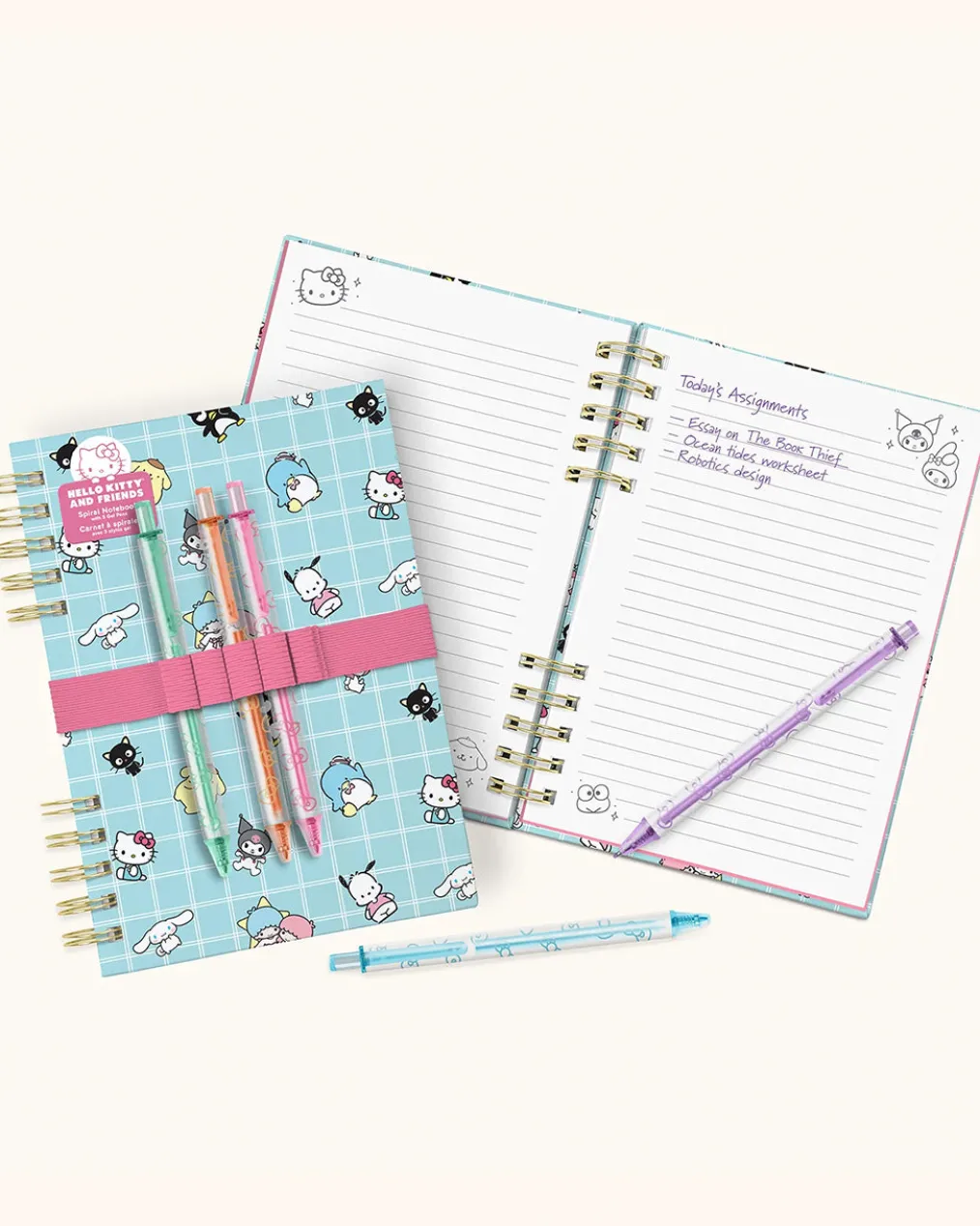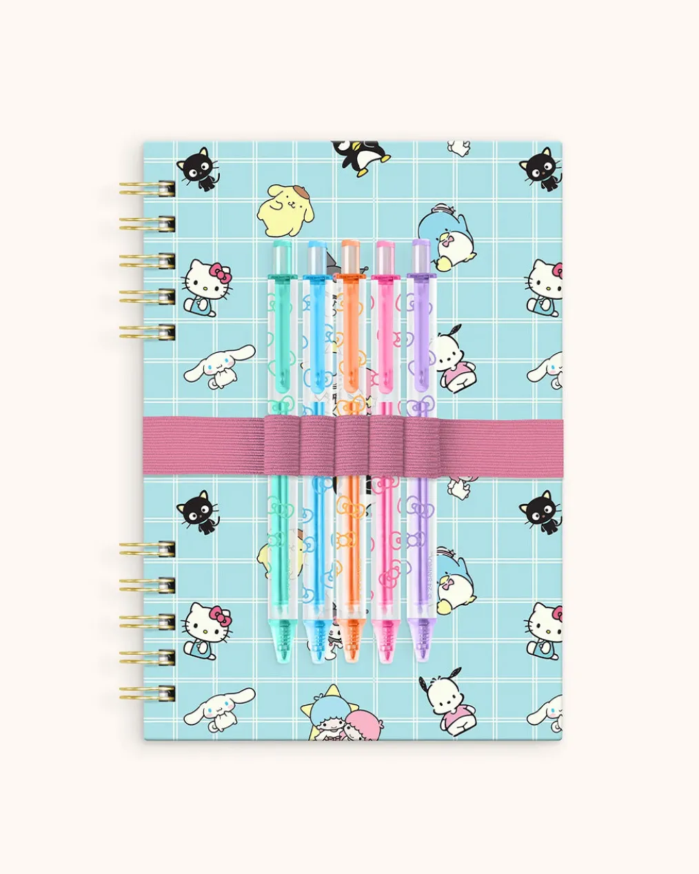 Never lose another pen again! This 192-page hardcover notebook, featuring your favorite Sanrio characters, comes with 100 gsm paper and convenient elastic loops on the cover stocked with five multicolored pens—use as is or swap ’em out with your personal faves. Whether you’re taking notes in class or mapping out your next big adventure, this journal keeps your writing tools and beloved Sanrio characters right where you want them!