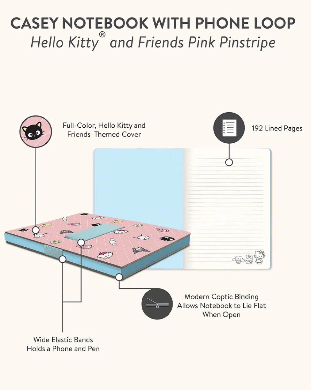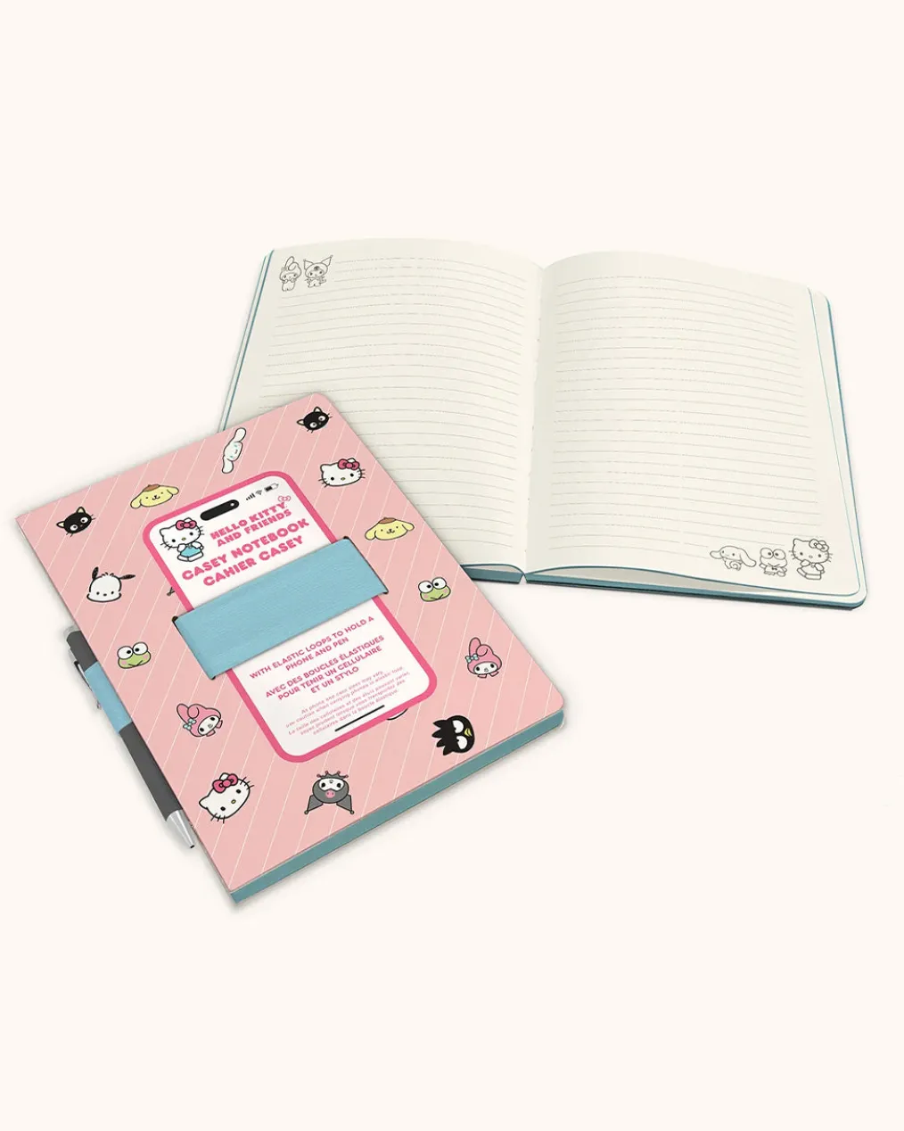 Pen? Check. Phone? Check. Adorable notebook with your favorite Sanrio characters? Check! The innovative Casey Notebook from Studio Oh!—featuring elastic loops to keep all your essentials together—is a must-have for classes, meetings, and everything in between. With 192 lined pages made of thick 100 gsm paper, Sanrio characters throughout the pages, and painted paper edges (for that extra “ooh!” factor), the Casey Notebook brings a little extra joy wherever you take it!