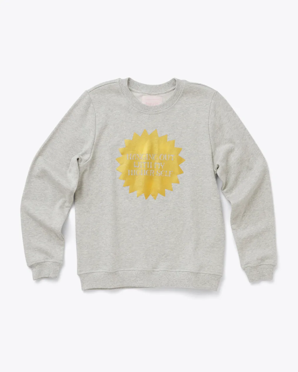 We call dibs on hanging out with your higher self when you’re done. This soft, comfortable long sleeve sweatshirt has oversized voluminous sleeves and a fuzzy flocked design.