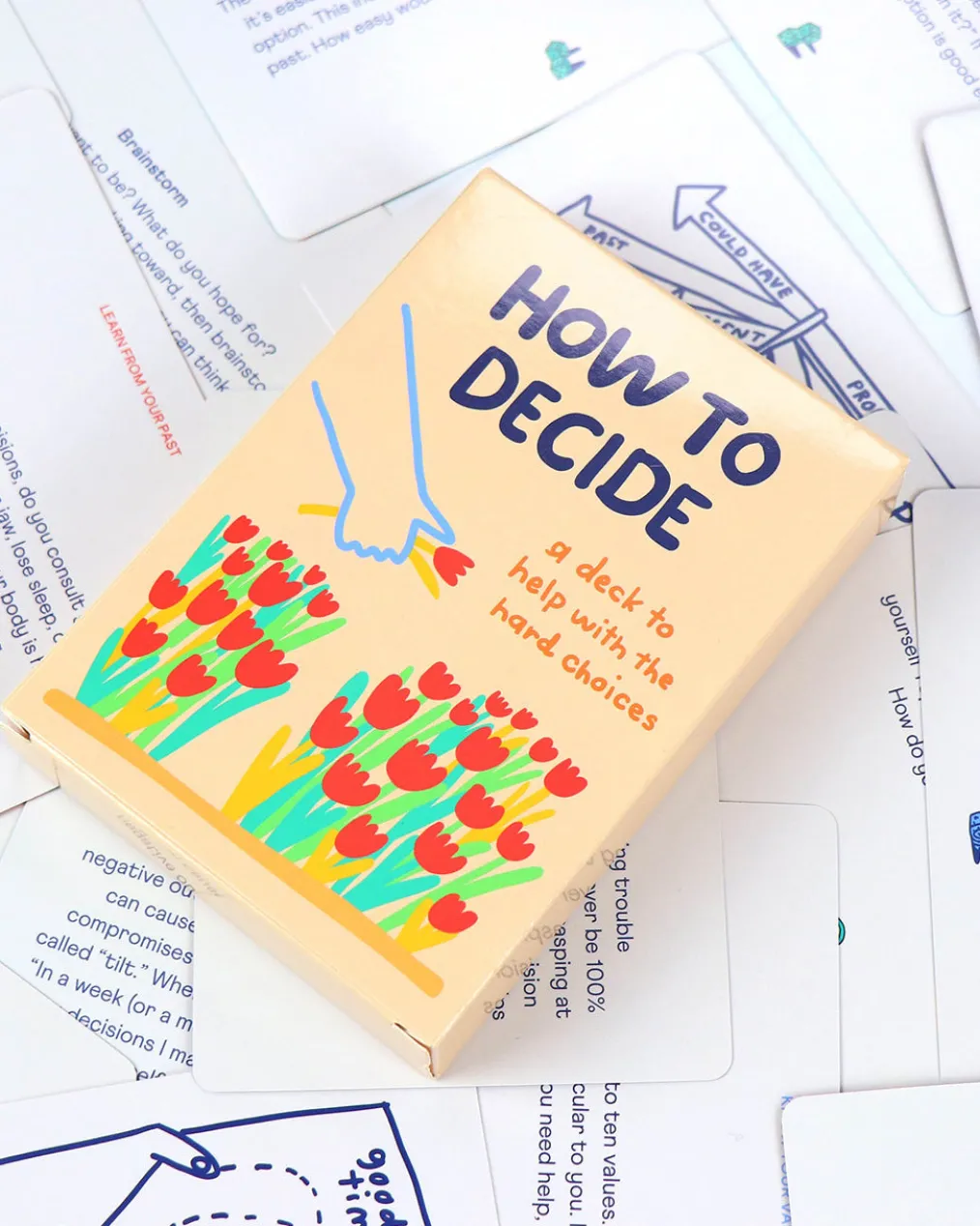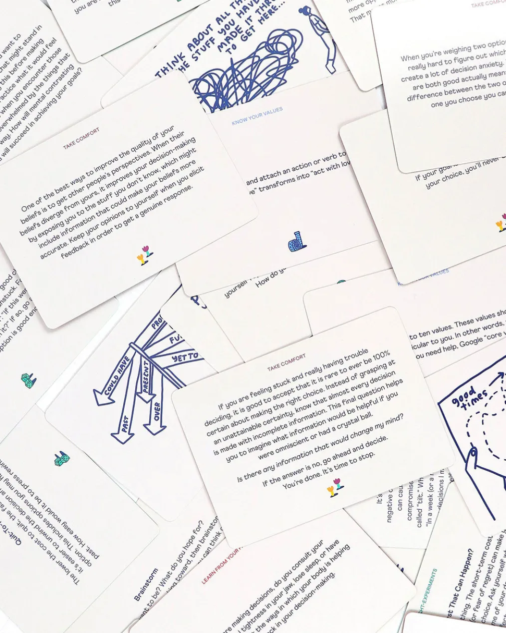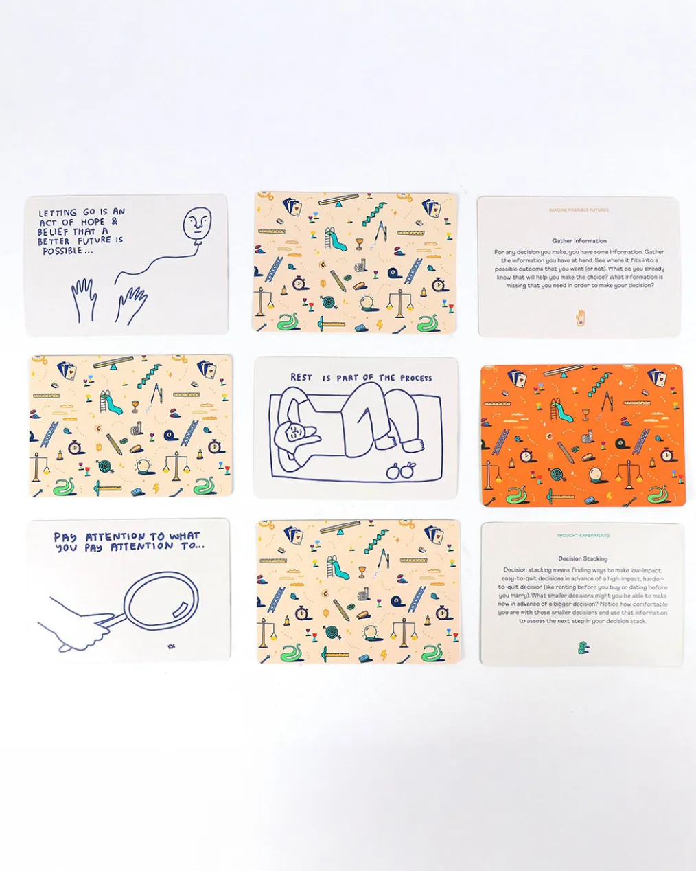The How To Decide deck offers different frameworks for thinking about the situation you are in and picking a route forward. When you feel stuck, choose an exercise or thought-experiment and see what comes up.