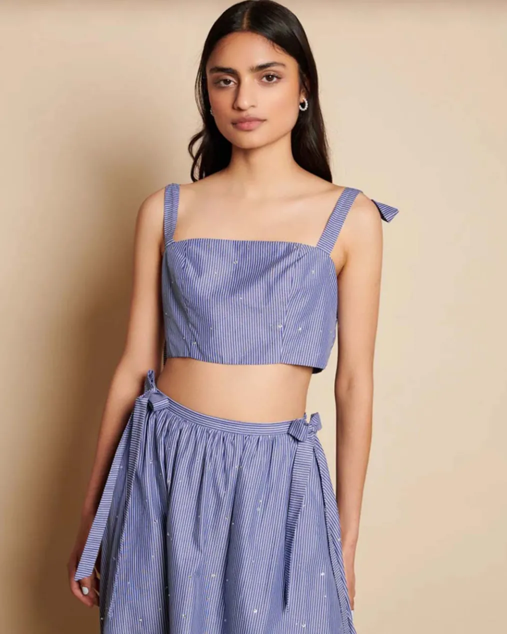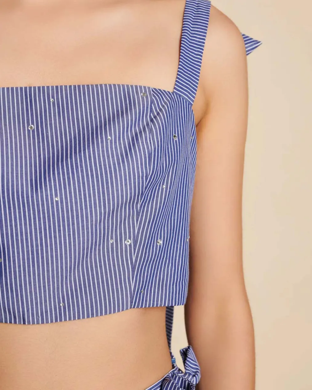- Fitted cami top in a stripe cotton fabric with all over gem embellishments.
