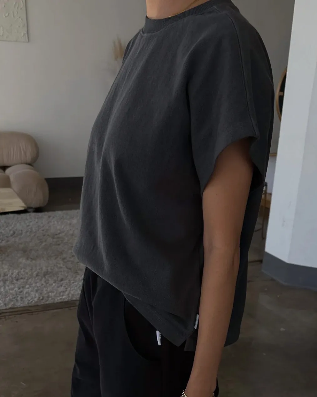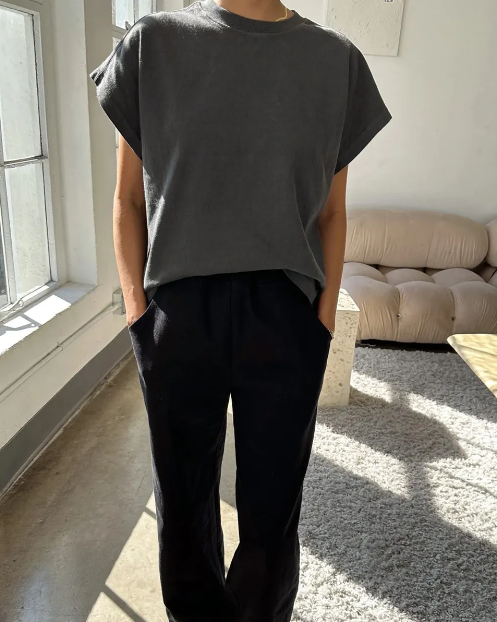 Jeanne Tee is Le Bon Shoppe’s perfect muscle tee. She features a shorter length to pair perfectly with high waisted bottoms but still give enough coverage for mid-rise bottoms and just the right amount of off shoulder dolman sleeve. She has a high crew neck with an extra wide neckband that adds to her signature charm.