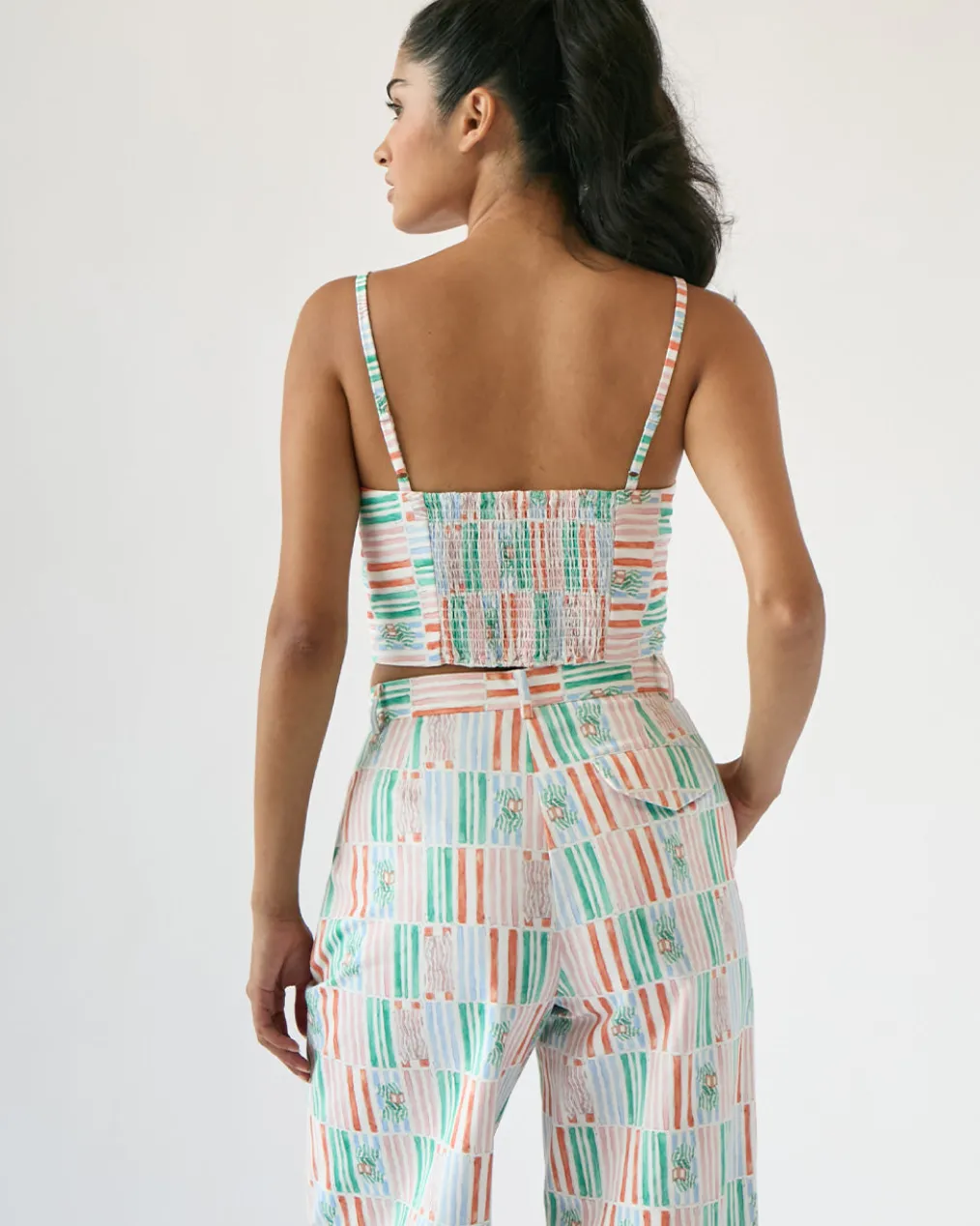 A patchwork of beach chairs and pool towels grace Keller’s bustier silhouette, casually tousled as if their tiny owners just dove into your cleavage. Rachel Antonoff’s newest spring top’s structured bodice makes it a perfect choice for date night, while the adjustable spaghetti straps and 100% cotton twill construction promise to keep your pits fresh in even the most humid or awkward environments.