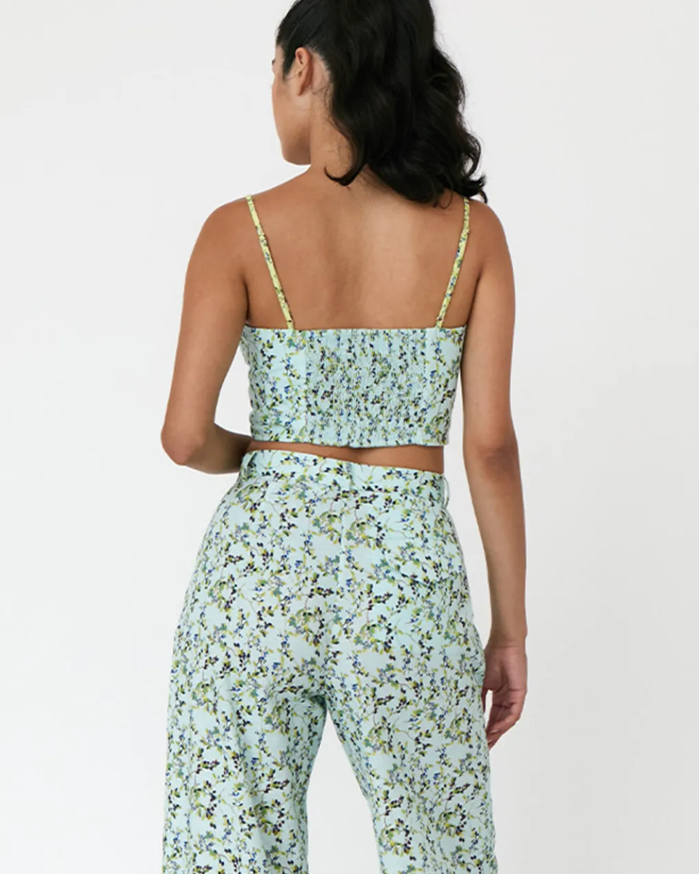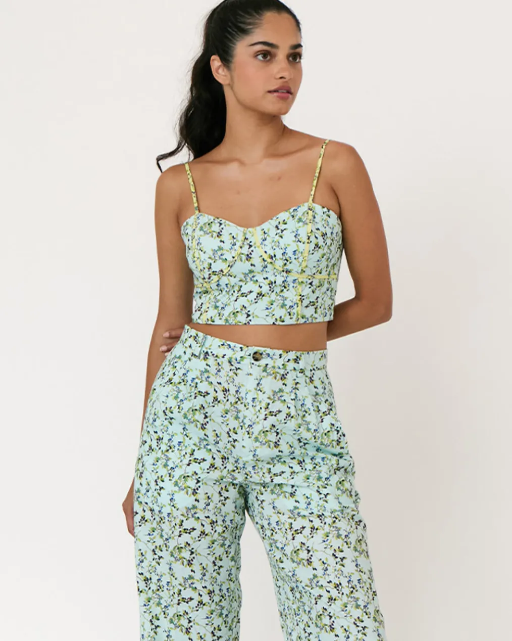 Sometimes sweet, sometimes sour, often blue: blueberries, they’re just like you! Celebrate everyone’s favorite oatmeal topping in Keller, a baby blue crop top with subtly provocative yellow piping along the bust. Match patterns while mixing proportions with the complimentary wide-leg Rose pant, or pair Keller with your favorite faded jeans and a kicky boot.