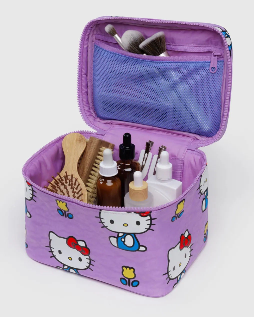 A roomy cosmetic case designed to make packing easier.