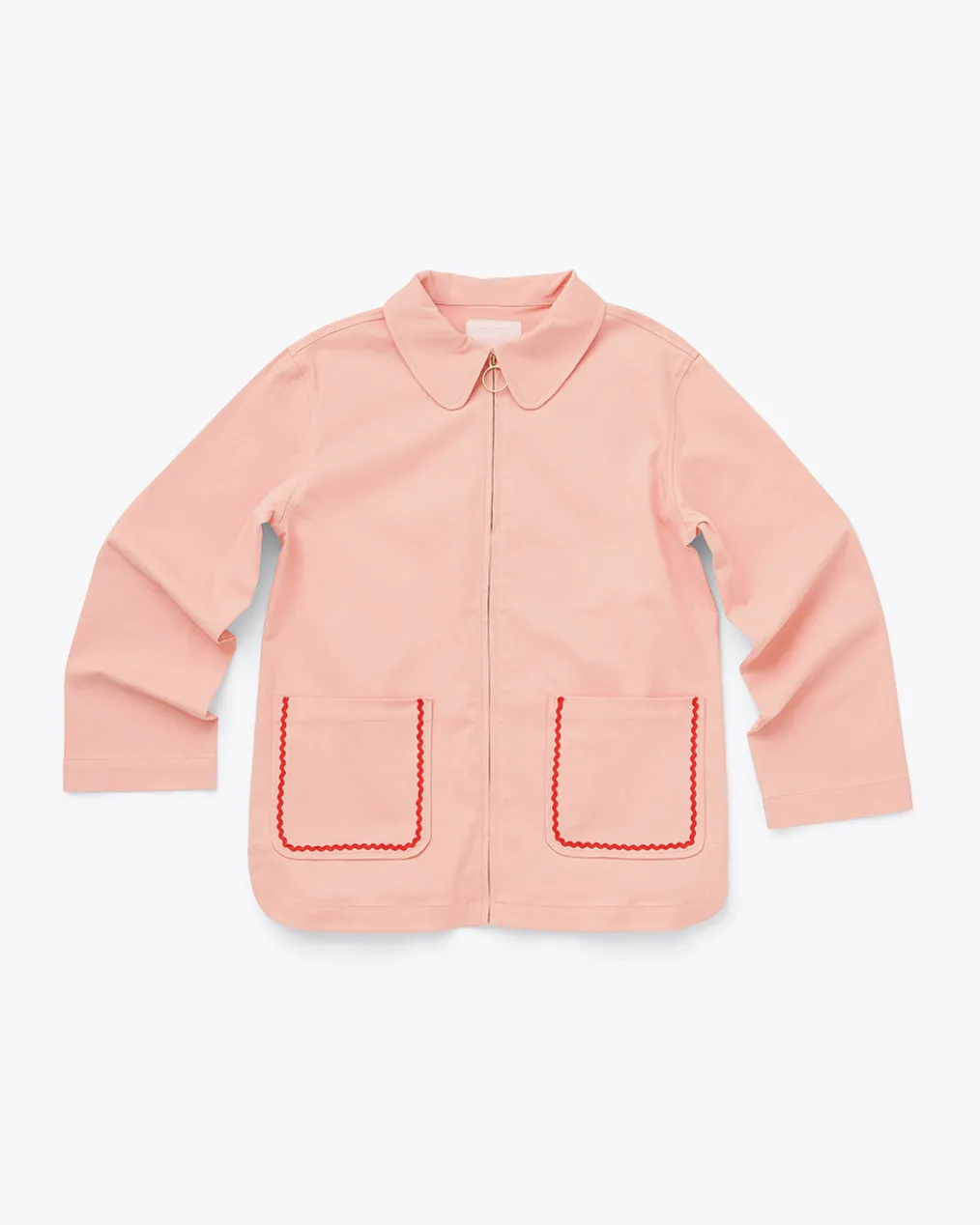 A chic jacket with just a pop of fun. This has a zip front, patch pockets, and rick rack trim.