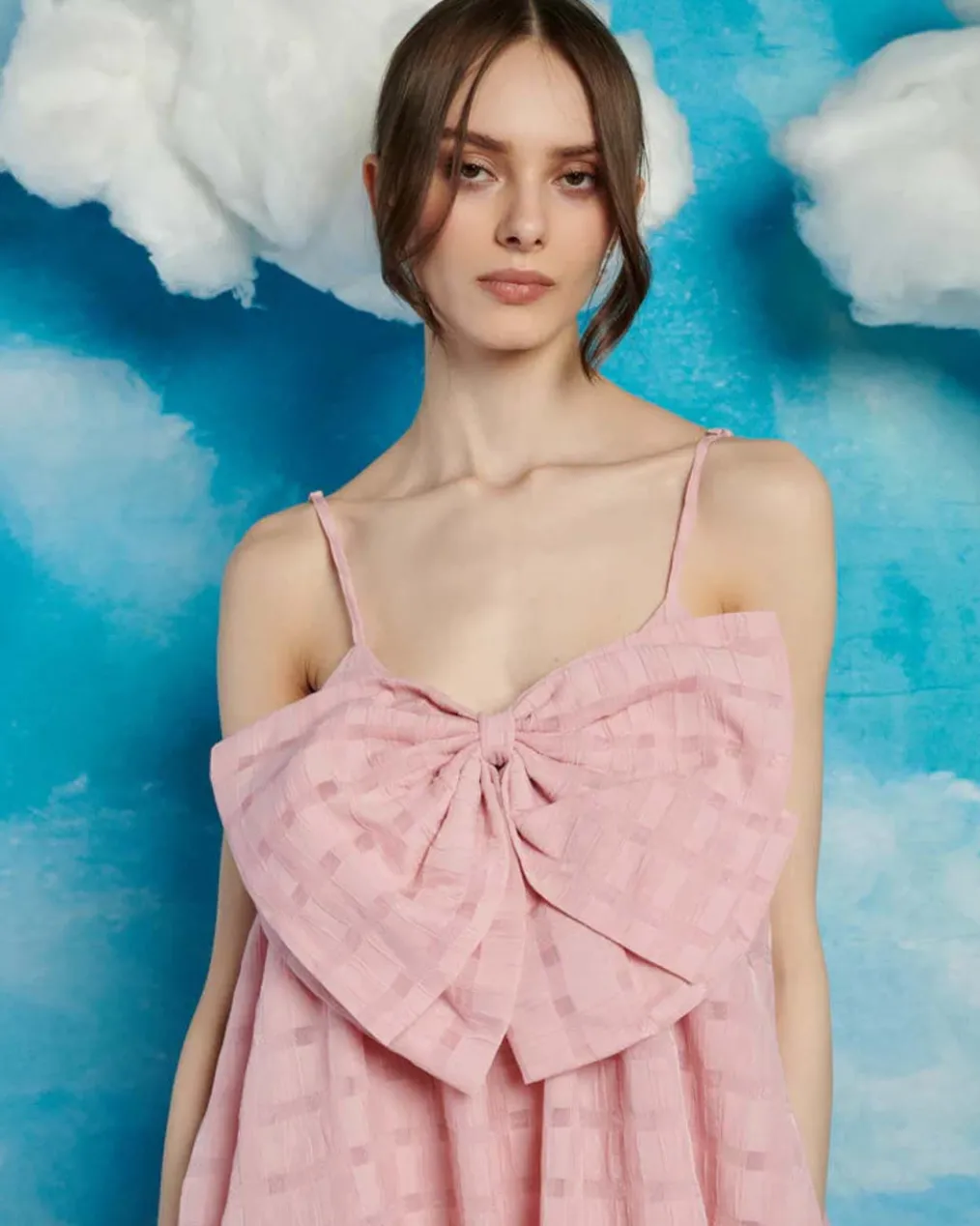 - Finished with adjustable thin shoulder straps and statement bow at the front.