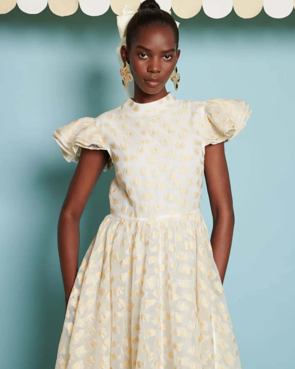 Midi dress with a fitted waist in a floral organza jacquard fabric. Fully lined and detailed with layered cap sleeves. Finished with a pleated hem panel.
