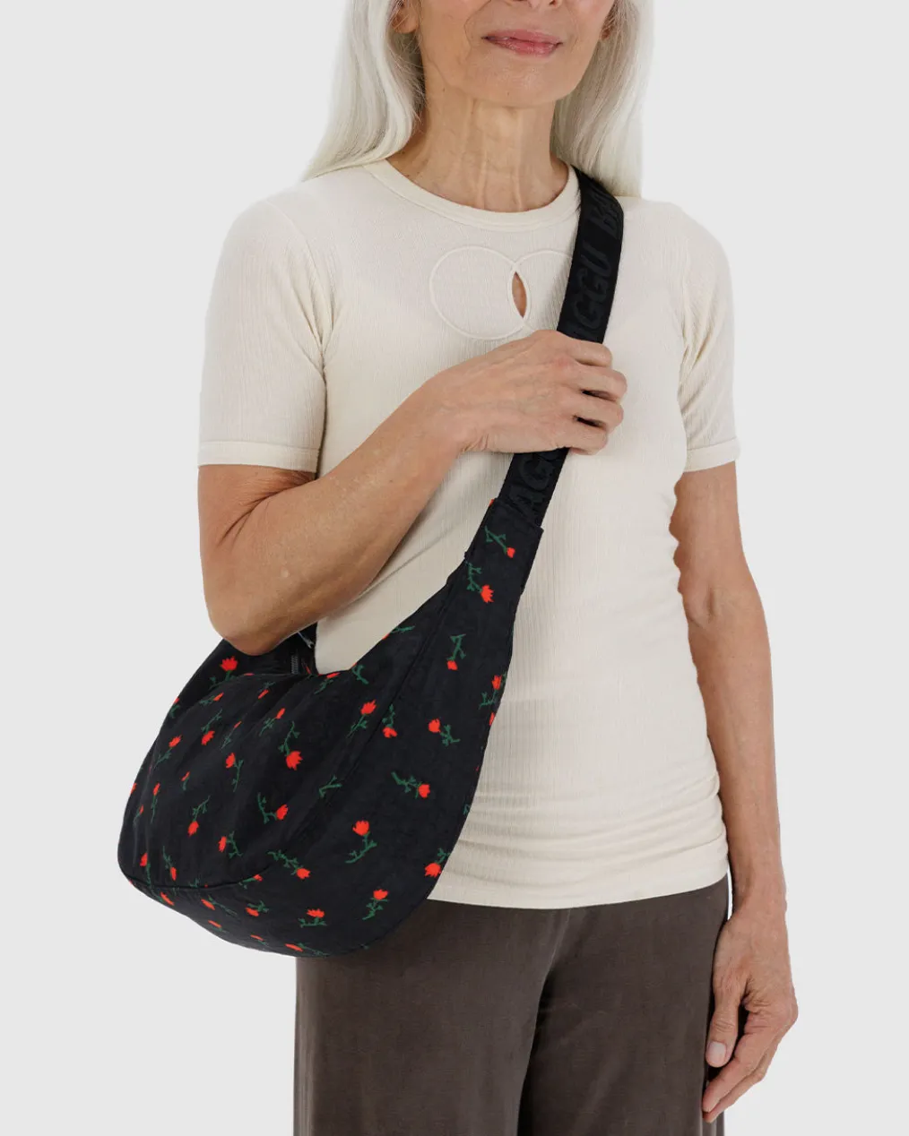 Lots of neat things are crescent-shaped: bananas, cashews, croissants, and now this Baggu bag. It features two interior zip pockets, an adjustable strap, and machine-washable fabric.