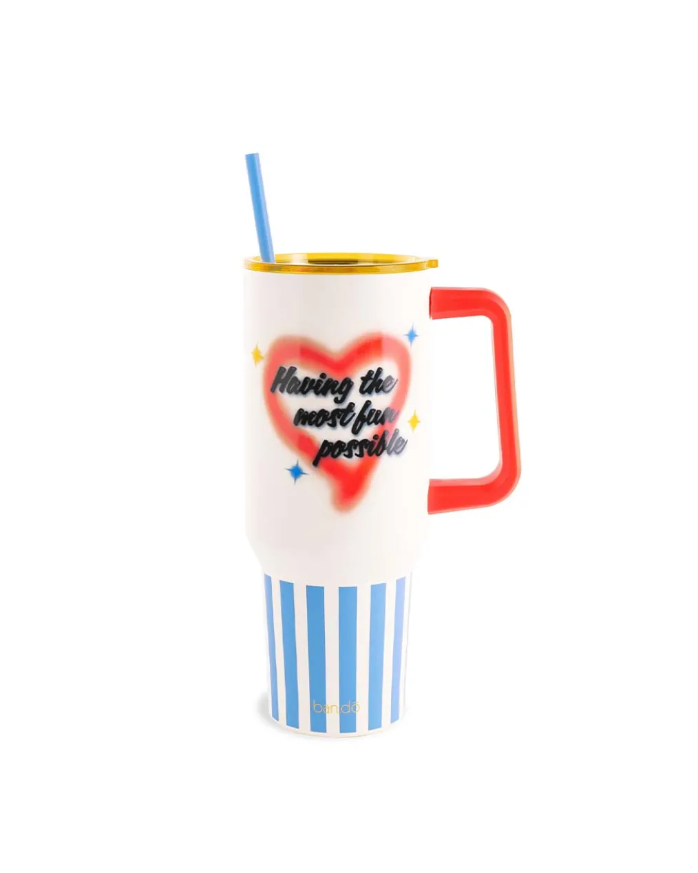 For serious hydration fans only! This stainless steel tumbler has an oversized design, handy handle, and flexible plastic straw.