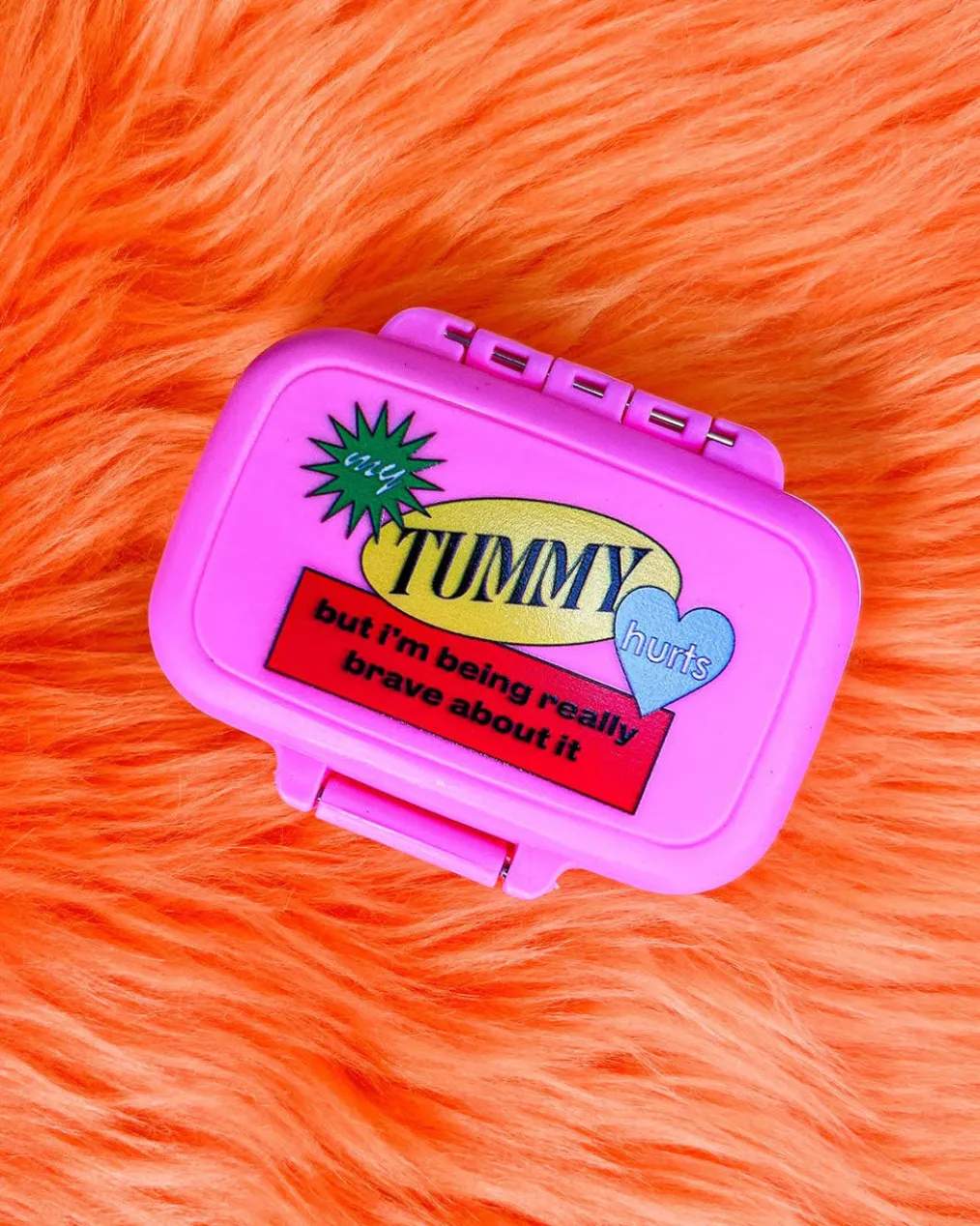 My tummy hurts, but I’m being really brave about it! This popular design now comes in a pill container. Carry your meds and vitamins in style with this pink pill case that has two convenient, removable dividers on the inside that creates 3 separate compartments . Shaped like an adorable mini suitcase. Waterproof + smell proof!