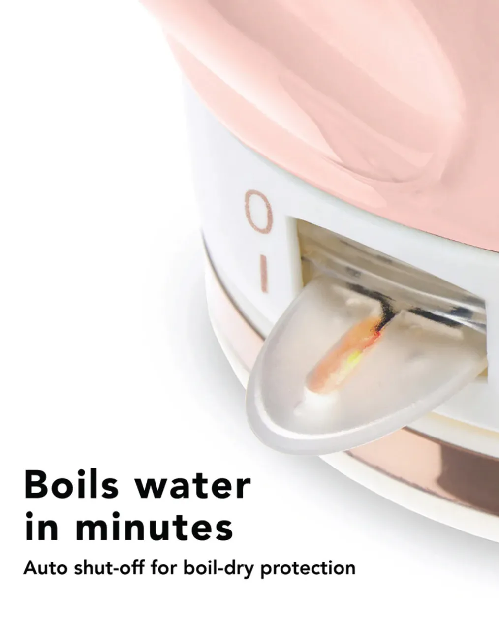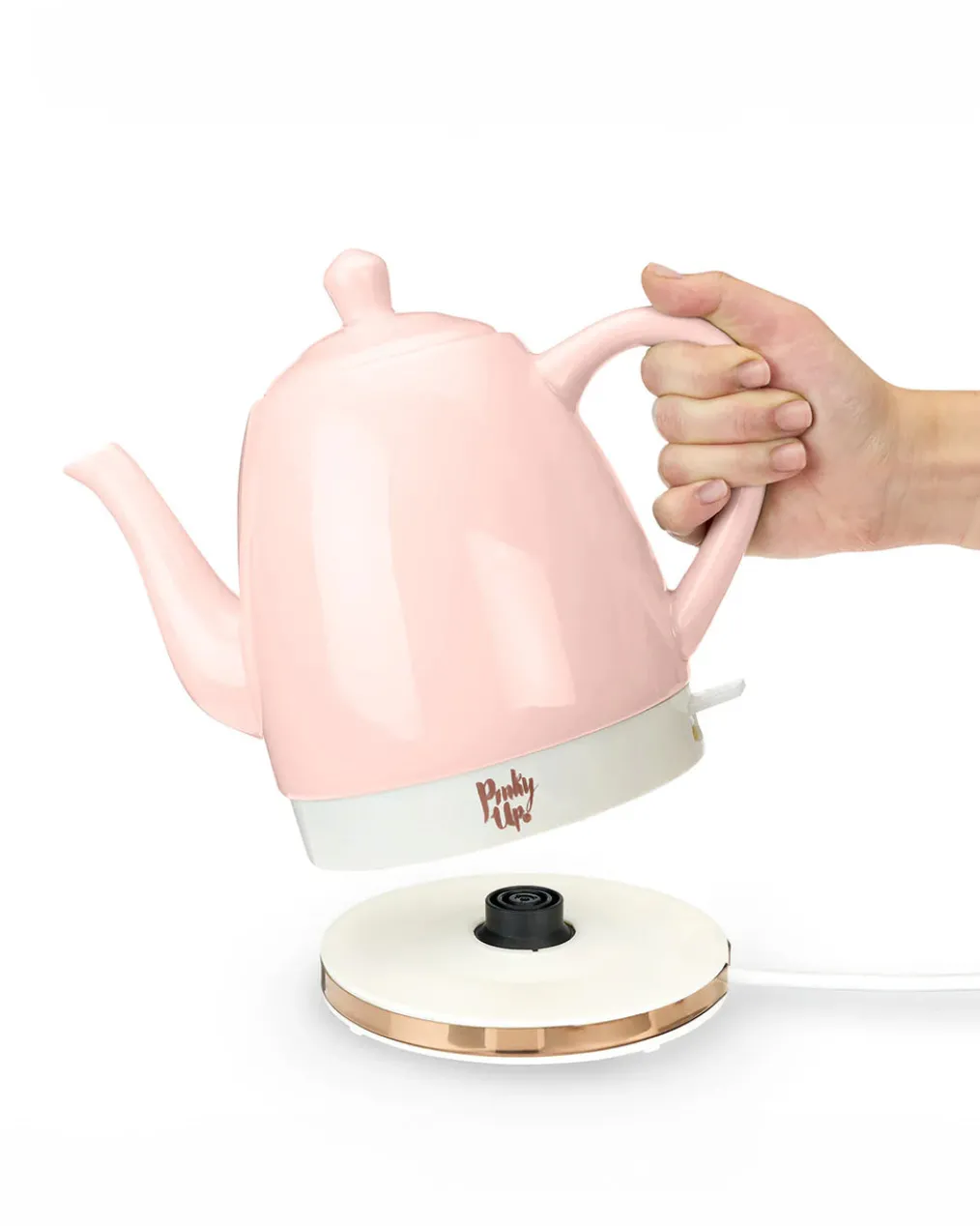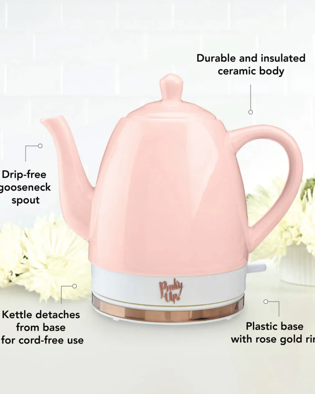 Fashion meets function with this stylish tea kettle. The Noelle Ceramic Electric Tea Kettle features glossymintceramic glazing and a trendy rose gold metallic base. Includes a plug-in base, 1.5 L capacity, and an easy on/off switch.