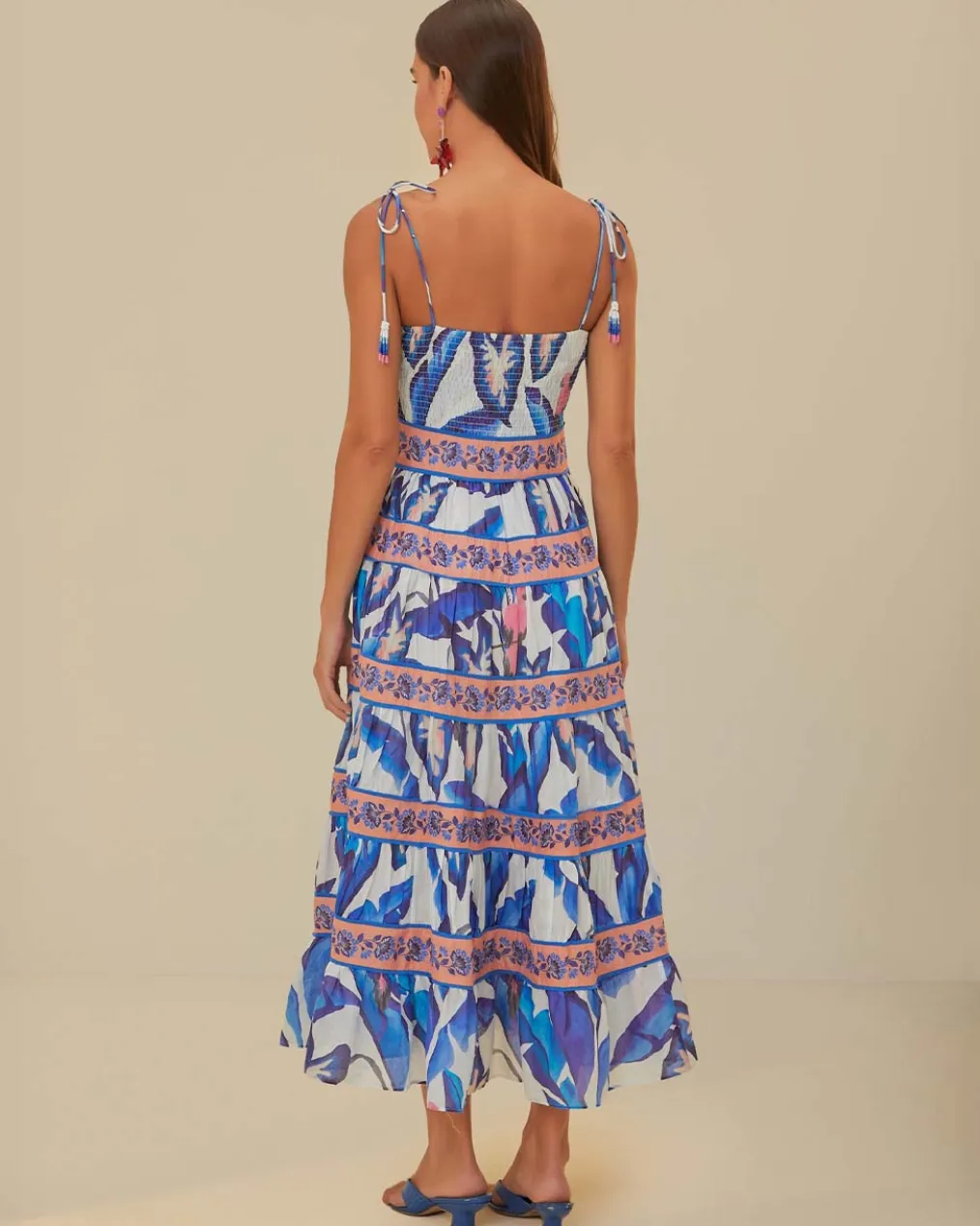 Embrace the rhythm of nature with the Off-White Blue Foliage Midi Dress, enchantingly tailored with a square neckline. Its tapestry of blue foliage dances across an off-white hue with layers creating a fluid silhouette. Delicate tiered ruffles cascade down, while the playful straps, finished with tassels, add a touch of whimsy. Find your own story woven into the soft, ethereal fabric of this captivating piece.
