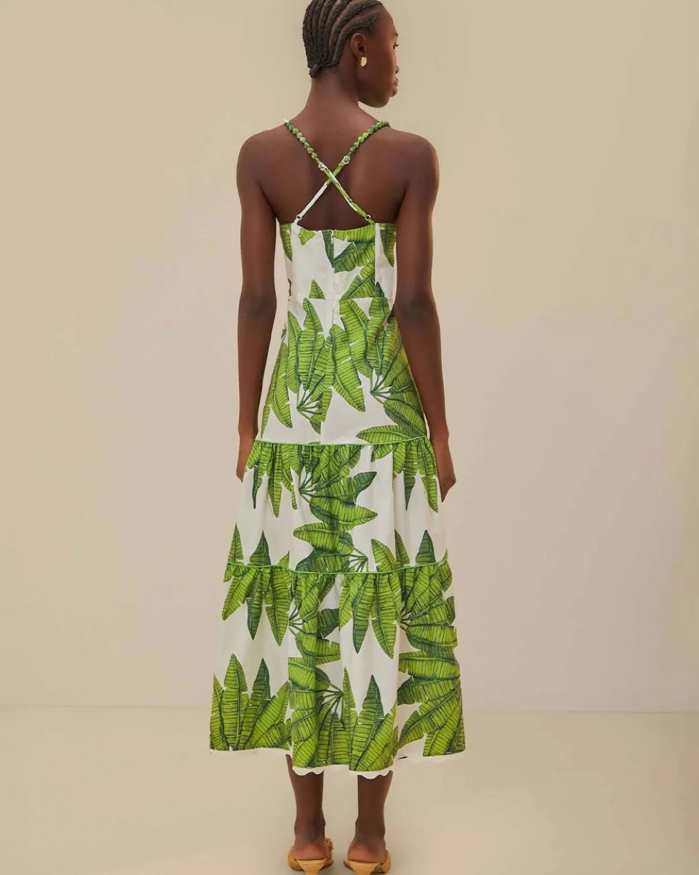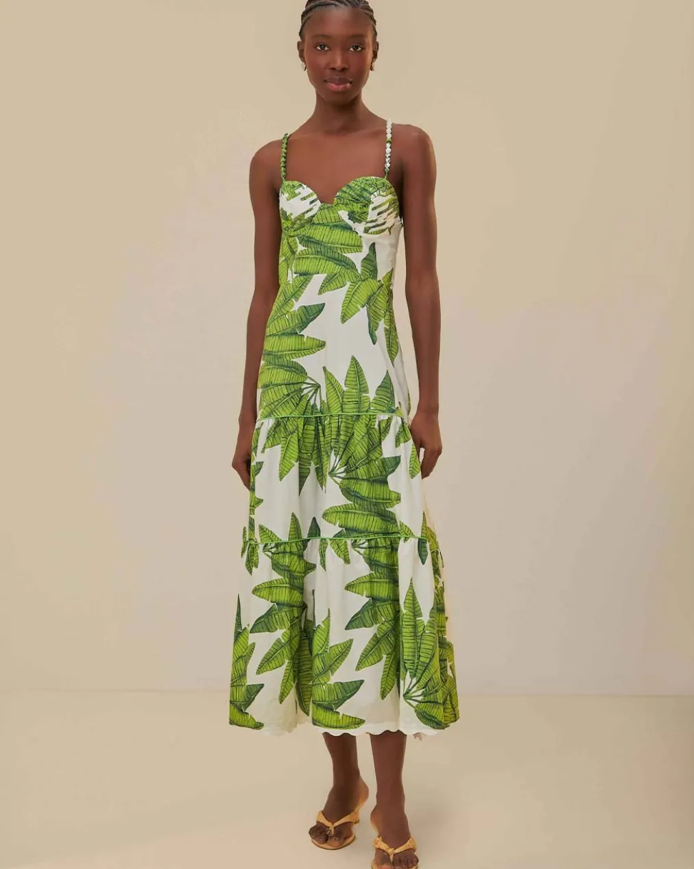 Breathe in the tropical allure of the Palm Fan Off-White Midi Dress, adorned with a refreshing green palm leaf print. This enchanting piece features a flattering sweetheart neckline and playful braided straps, creating a harmonious symphony of natural elegance and graceful femininity. The tiered skirt dances around the mid-calf, promising to whisk you away on an endless summer adventure with every swish. Indulge in the beauty of nature elegantly draped in this exquisite FARM Rio creation.